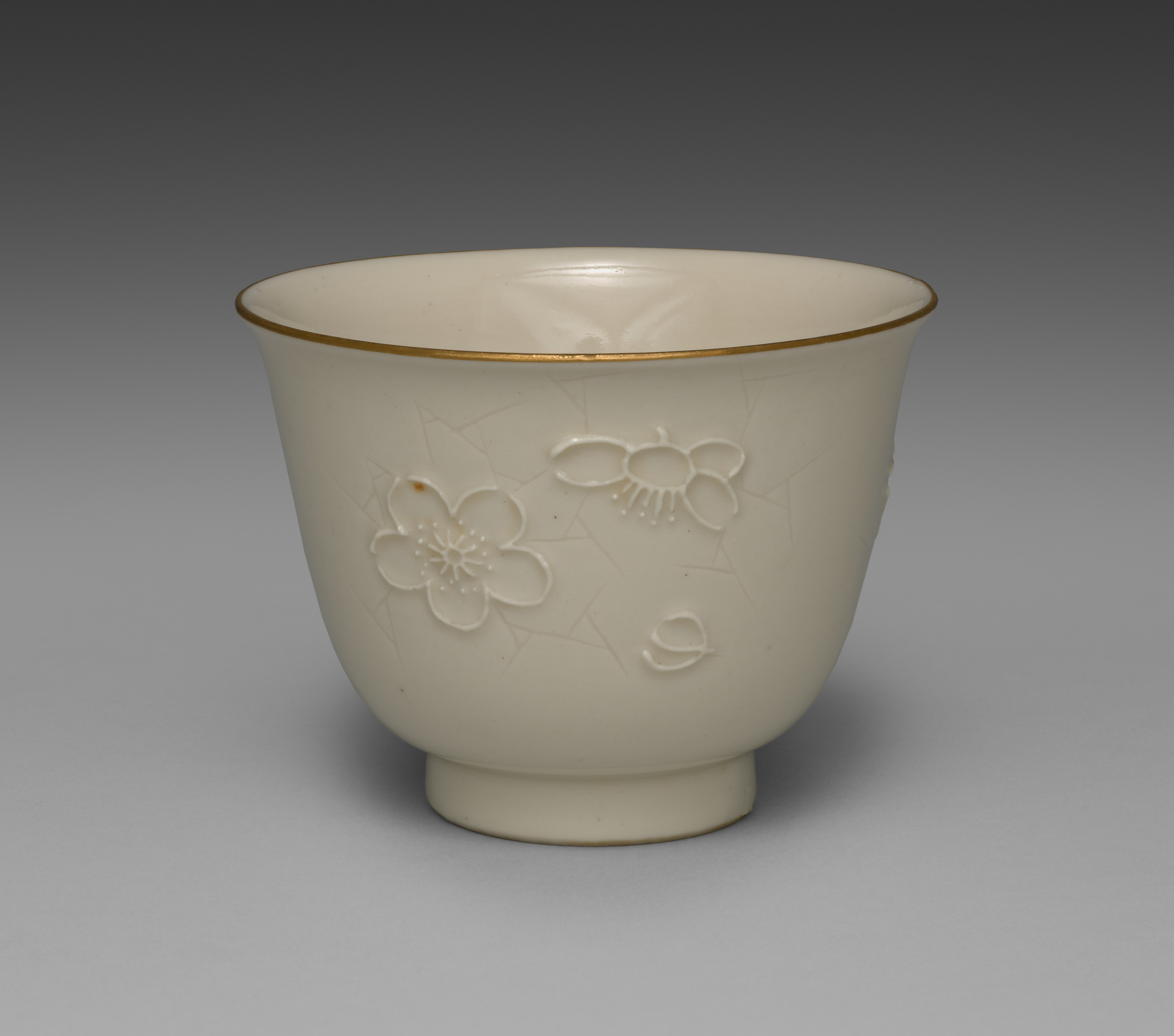 White porcelain cup with gold rim, rounded body, and short foot. Embossed design on the body features plum blossoms and cracked-ice pattern. The blossoms have five petals and a cluster of stamens in the center. The cracked-ice pattern consists of intersecting lines forming small polygons. The interior of the cup is plain and smooth. The background of the image is a gradient from dark gray at the top to light gray at the bottom.