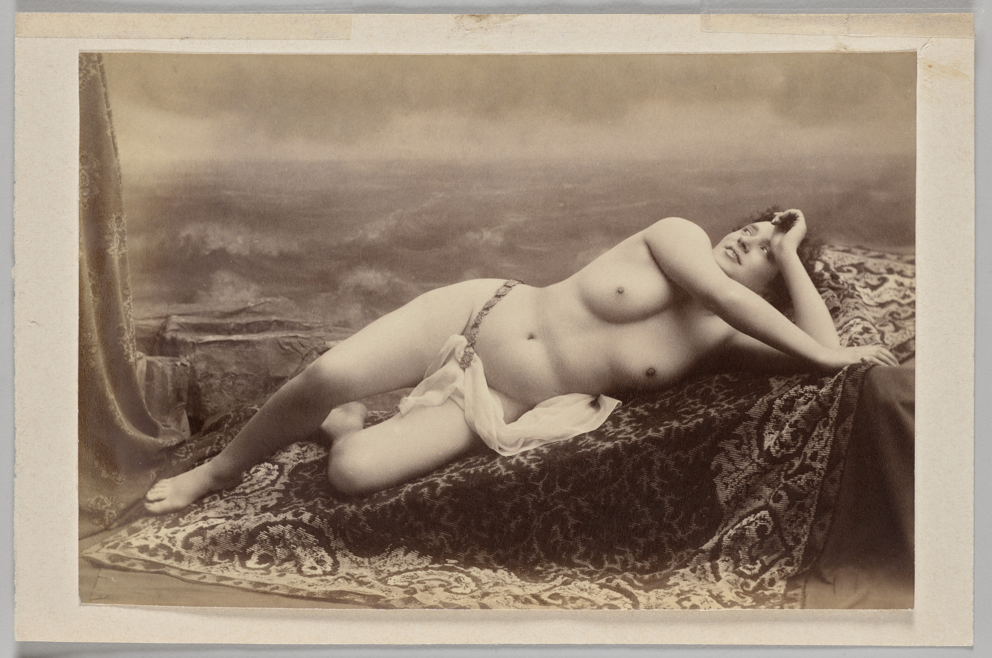 Untitled (reclining nude on carpet against painted backdrop of waves)