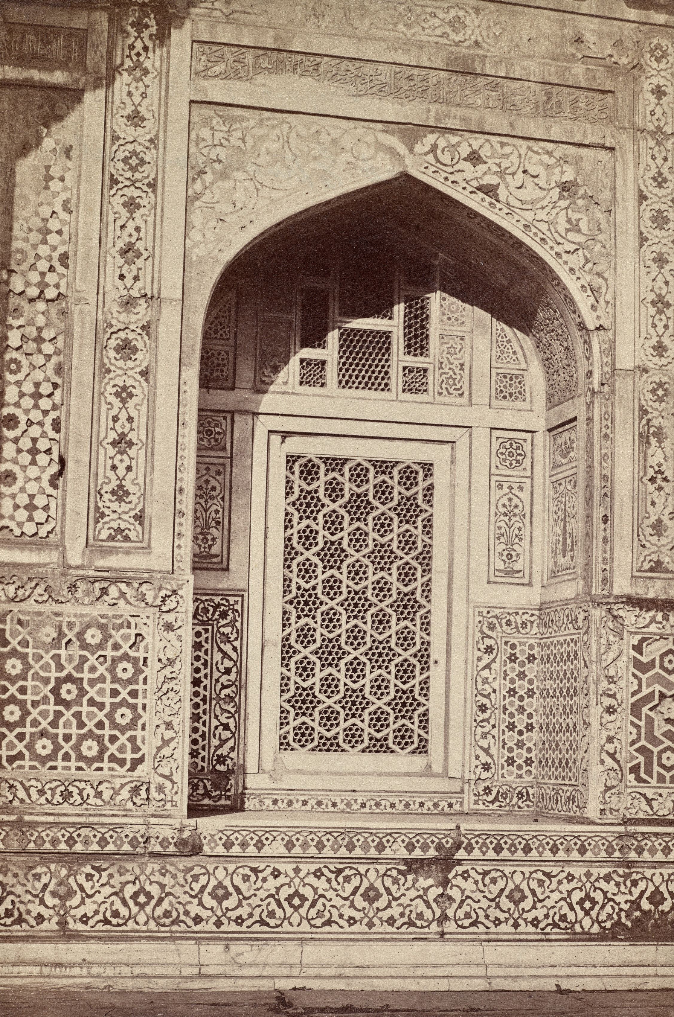 The image depicts a close-up view of an intricately designed wall with an arched opening. The wall and archway are made of stone and feature various patterns, including geometric shapes and floral designs. The archway's opening reveals another room or area behind it, also decorated with ornate patterns on the walls and a window with metal grating. The overall aesthetic suggests a historic or cultural building, likely from the Mughal era, given the style and craftsmanship. The image is rendered in sepia tones, adding to its vintage and historical feel. The photograph is by an unknown artist, titled "Untitled (Jama Masjid, Delhi)".