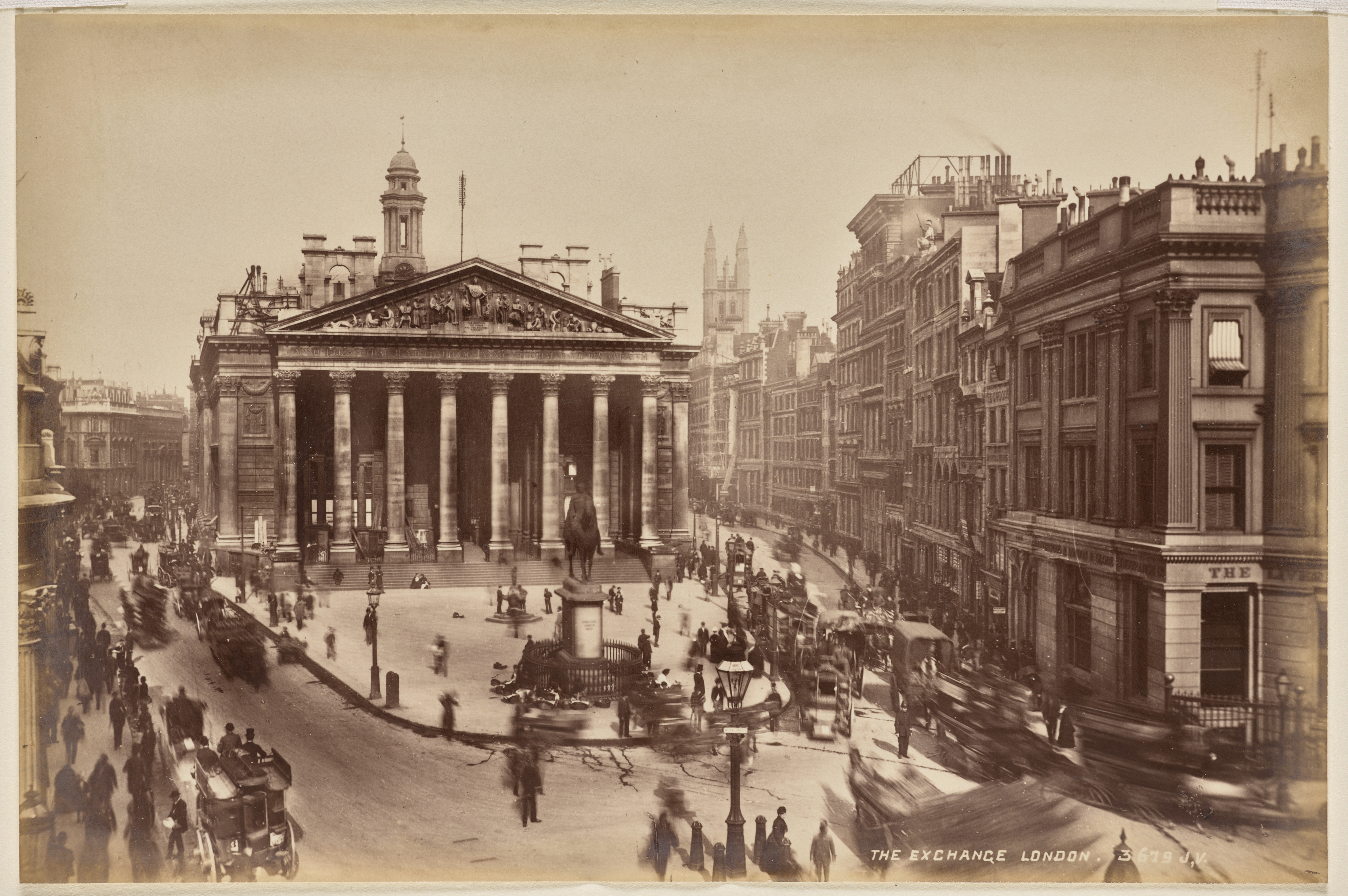 Sepia-toned photograph of a city street. A large stone building with tall columns and a triangular roof is on the left. A statue of a man on a horse stands in front. The building has a row of columns along the front with a railing on top. A dome-shaped tower rises behind. The street is wide with people walking on the sidewalk and crossing. Several old-fashioned cars and horse-drawn carriages are on the street. Buildings line the right side of the street. Some have balconies and ornate facades. A building with "The Exchange" on the front is on the right. City buildings are visible in the background. Text at the bottom reads "The Exchange, London".