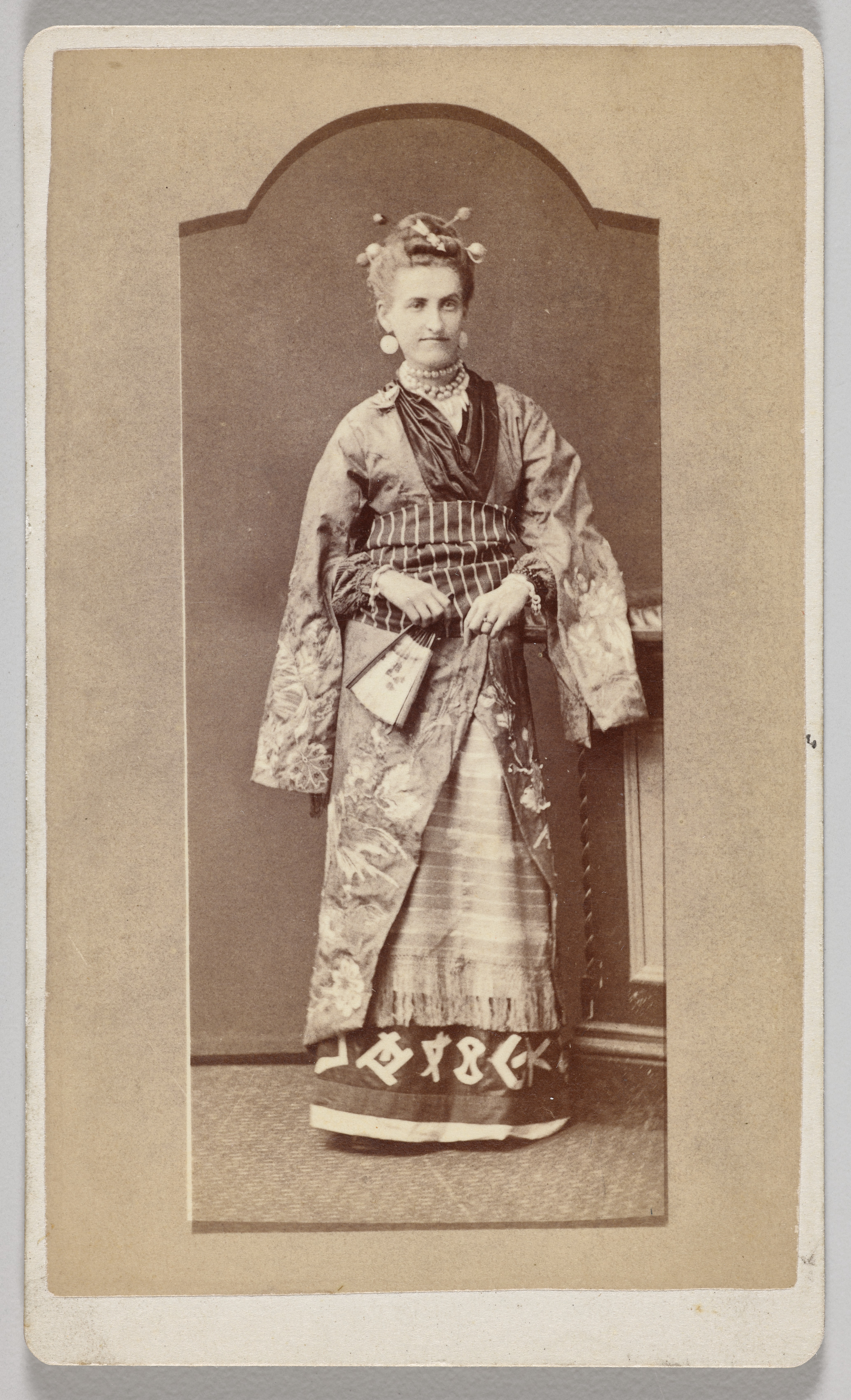 Sepia-toned photograph of a white woman wearing a traditional Japanese kimono and holding a fan. The woman has her hair styled up with pins and wears a long kimono with a floral pattern and a striped underdress. She accessorizes with a necklace, earrings, and a small purse. The background features an arched cutout, and the photo is mounted on a beige card with rounded corners. The woman stands on a patterned floor with a wall behind her.