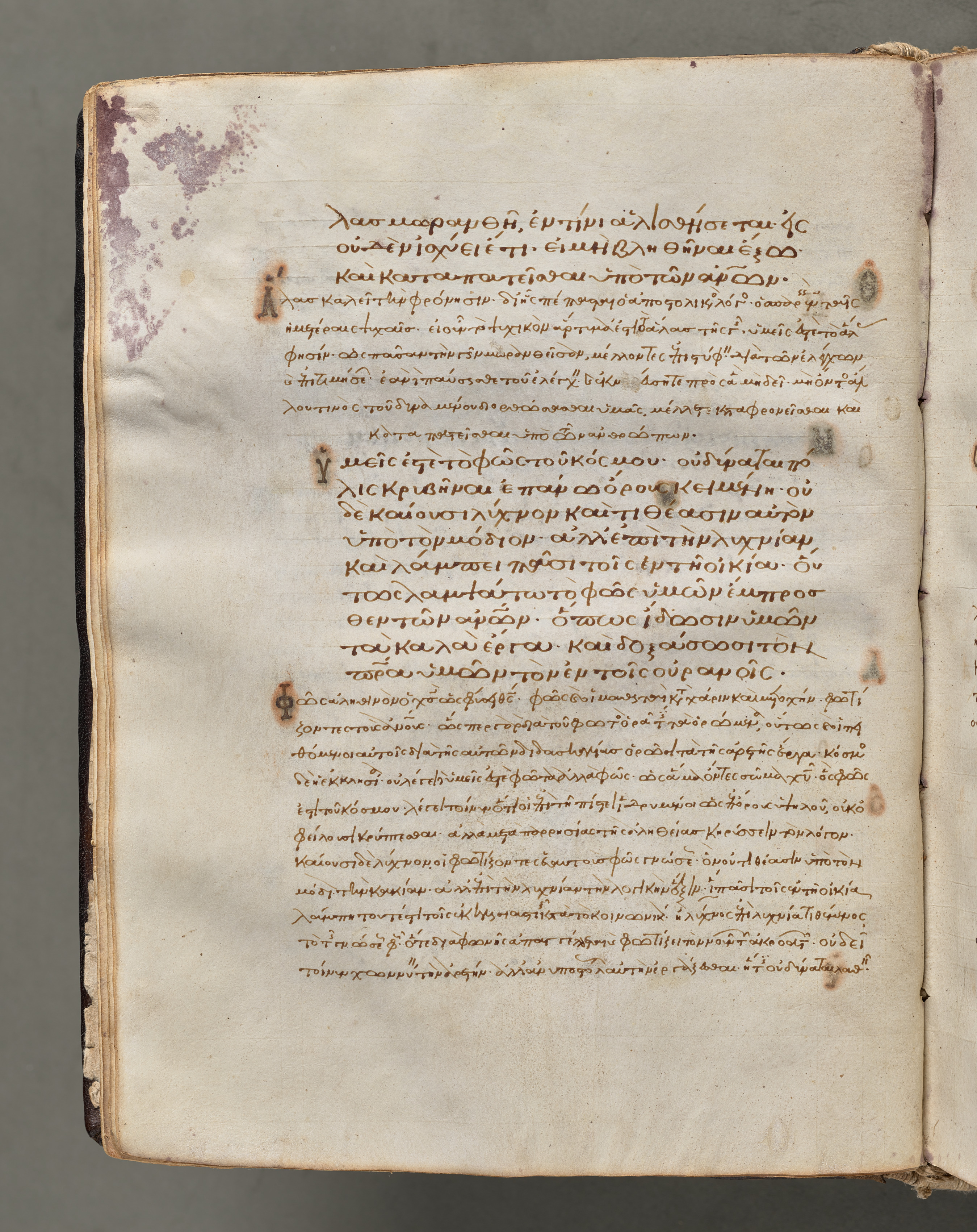 The image shows a book open to a page with text written in a language that appears to be ancient Greek. The book appears to be old and worn, with yellowed pages and visible signs of aging. * The page is off-white with brown edges. * The text is written in brown ink and consists of 31 lines. * The handwriting is cursive and appears to be in a formal or calligraphic style. * There are some darker spots on the page in the upper-left corner and on the right margin, possibly due to ink or water damage. * The right edge of the page appears to be slightly worn and torn. * The book binding on the left appears to be dark-brown leather with gold foil stamping on the spine. * The background behind the book is a solid gray color. * The book's title is "Text, folio 19 (verso), from a Gospel Book with Commentaries". * The artist of the book is unknown.