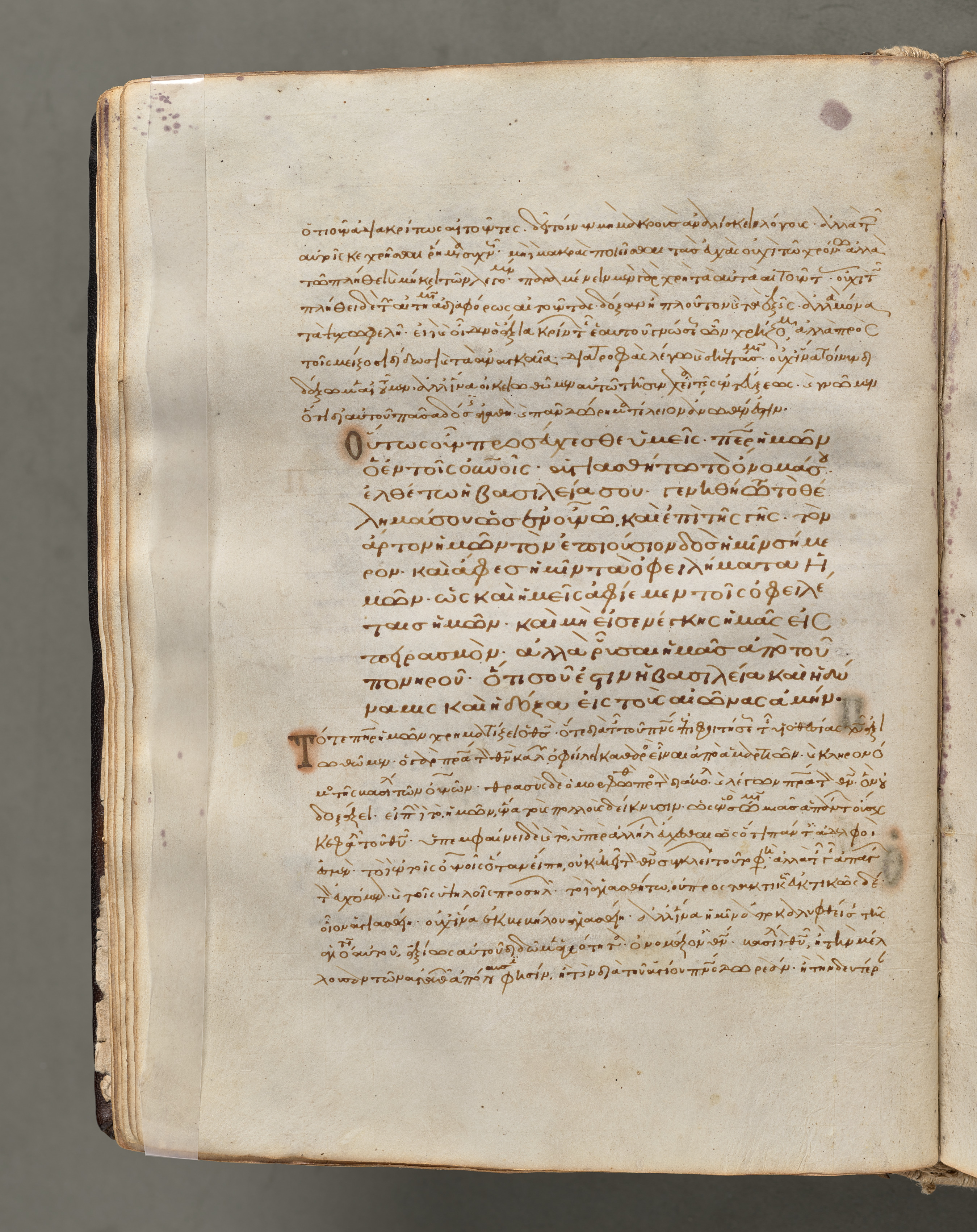 An open book with yellowed pages. The pages are off-white and have brown edges. The text on the pages is written in a language that appears to be Greek. There are 34 lines of text on the page shown, written in brown ink. A large letter "O" is in the middle of the page and a large letter "T" is near the bottom. The book is lying flat on a gray surface. The right side of the book's spine and pages are visible. The book is bound in a dark material. A small portion of a purple spot on the top right corner of the page. A darker brown mark on the bottom right side.