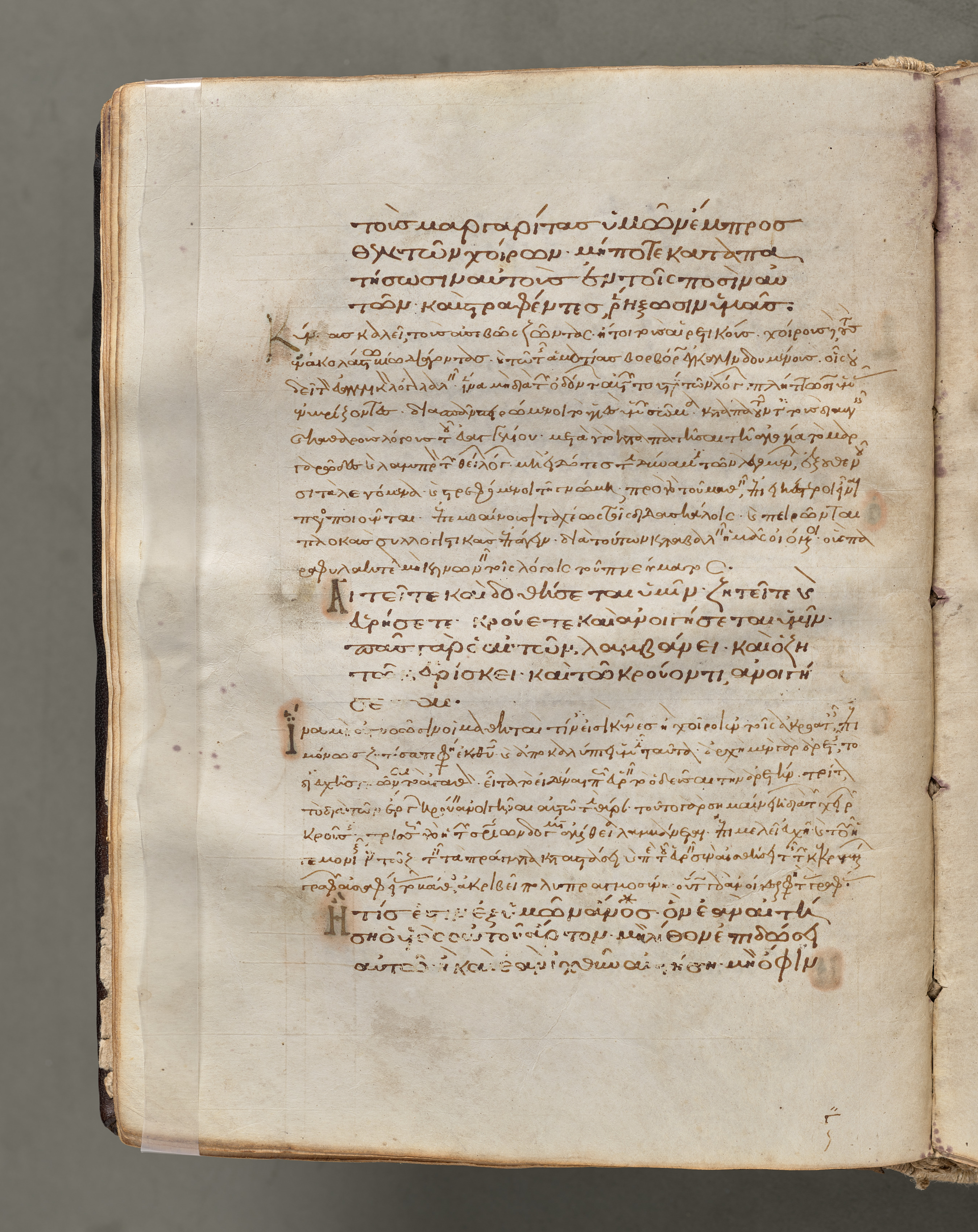 Folio 29, verso side, from a Gospel Book with Commentaries. The image shows a yellowed, aged parchment page with brown ink writing in an ancient script, likely Greek. The text appears to be handwritten and fills most of the page. Stains and signs of aging are visible on the page. The page is slightly torn and has pieces of tape along the edges. The background behind the page is gray.