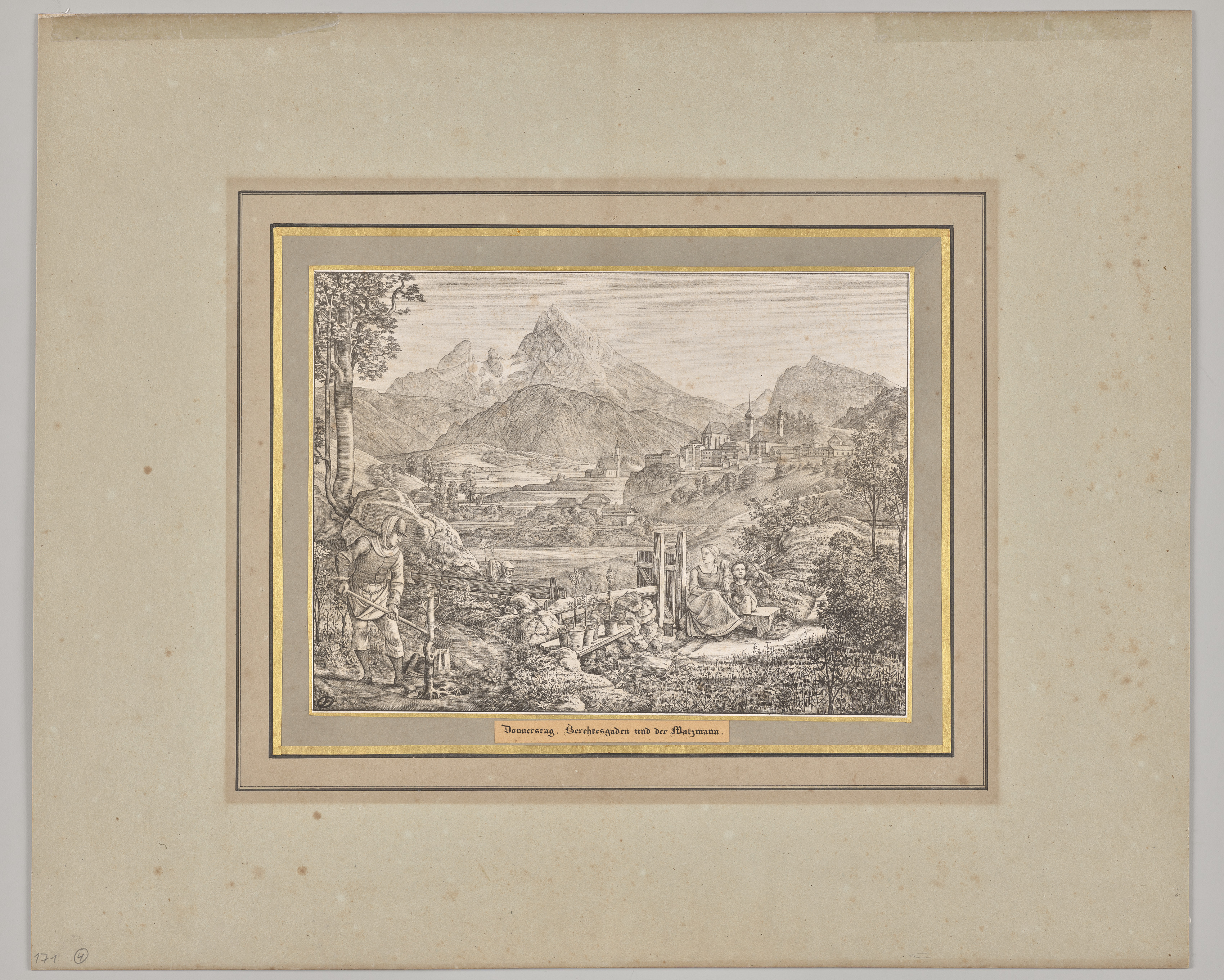 The image shows a landscape drawing of a mountainous scene with a town. In the foreground, a man is positioned on the left and a woman with a child on the right. The drawing is in shades of gray on a white background. The artwork is surrounded by multiple layers of borders. A thin black line borders the drawing, then a thicker yellow line, then a gray line, and then a thin black line again. Below the drawing, there is a small yellow rectangle with black text. The entire artwork is mounted on a beige background.