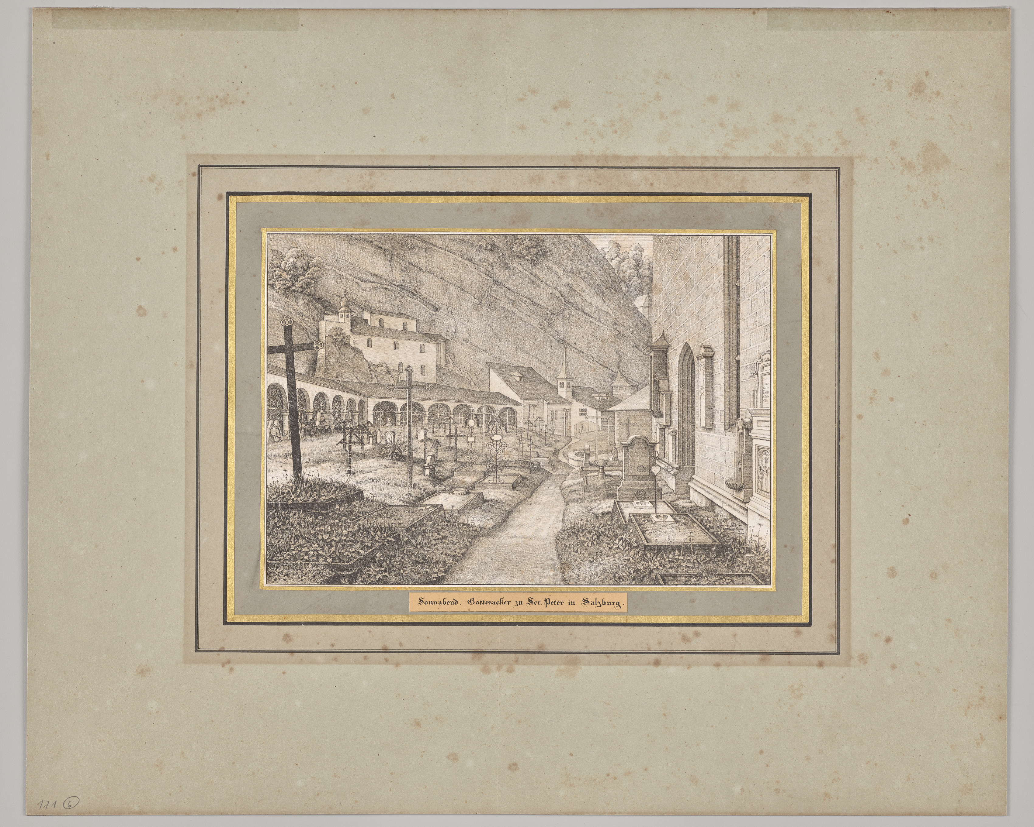 A grayscale drawing of a cemetery. A long narrow pathway runs down the middle. On either side are headstones. A large cross on the left. Buildings in the background. A large stone wall on the right. The drawing is surrounded by a thin black border, then a gray border, then a gold border. A caption reads "Samstag. Gottesacker zu Sct. Peter in Salzburg". The drawing is on a beige background with brown spots.