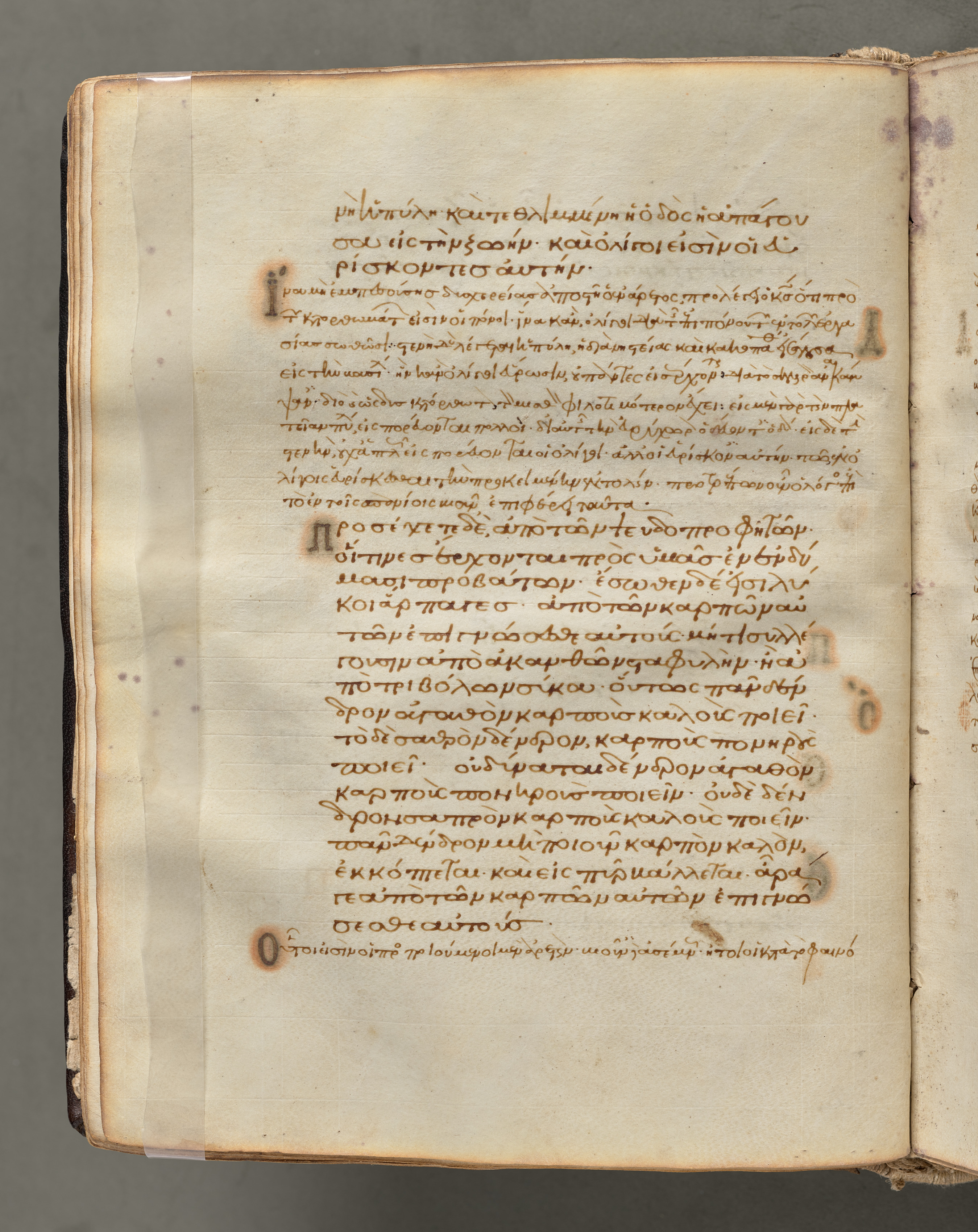 Open book with yellowed pages on a gray background, showing brown text written in a language that appears to be Greek. The pages are worn with visible signs of aging, including darkened edges, scattered spots, and a piece of tape on the left side. A darker mark on the upper right and discoloration resembling a burn mark on the bottom left. The text is arranged in paragraphs. The book's cover is not visible.