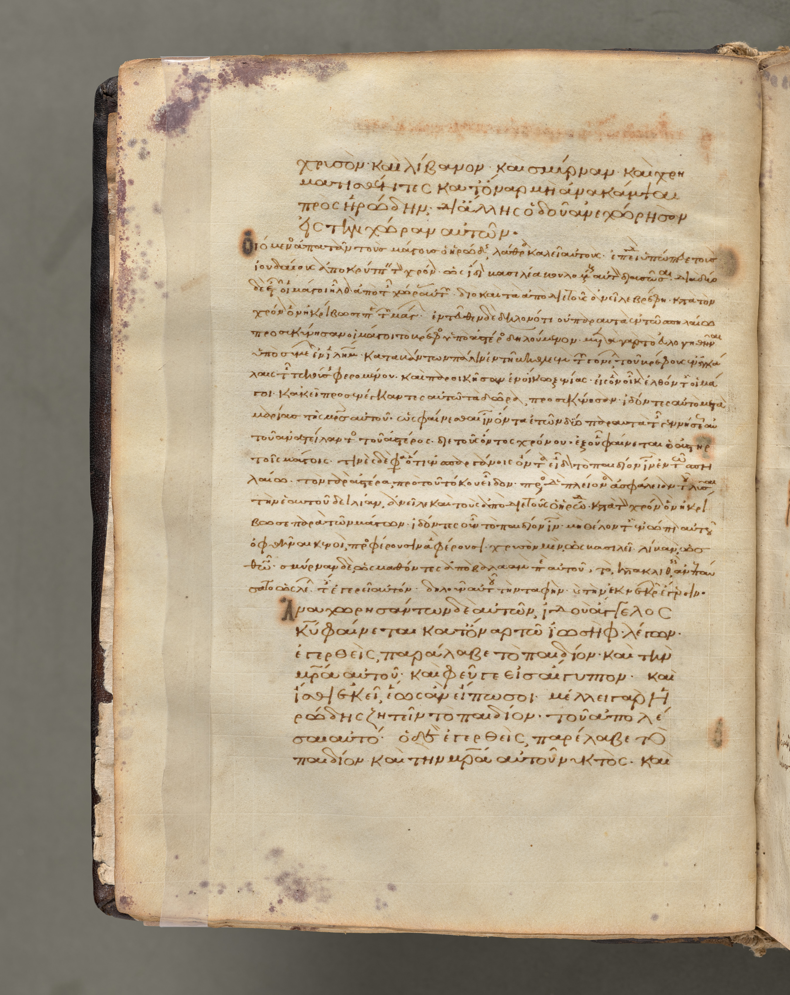 Yellowed, aged book page with visible signs of wear, including dark spots and discoloration; text written in brown ink in a language that appears to be Greek; right page of a book lying flat, with left edge of the page slightly curled and right edge flat against a surface; text divided into sections with some words or phrases underlined or written in a slightly larger font; dark-colored binding or cover on the left edge of the page; gray background. Title: Text, folio 10 (verso), from a Gospel Book with Commentaries Artist: Unknown