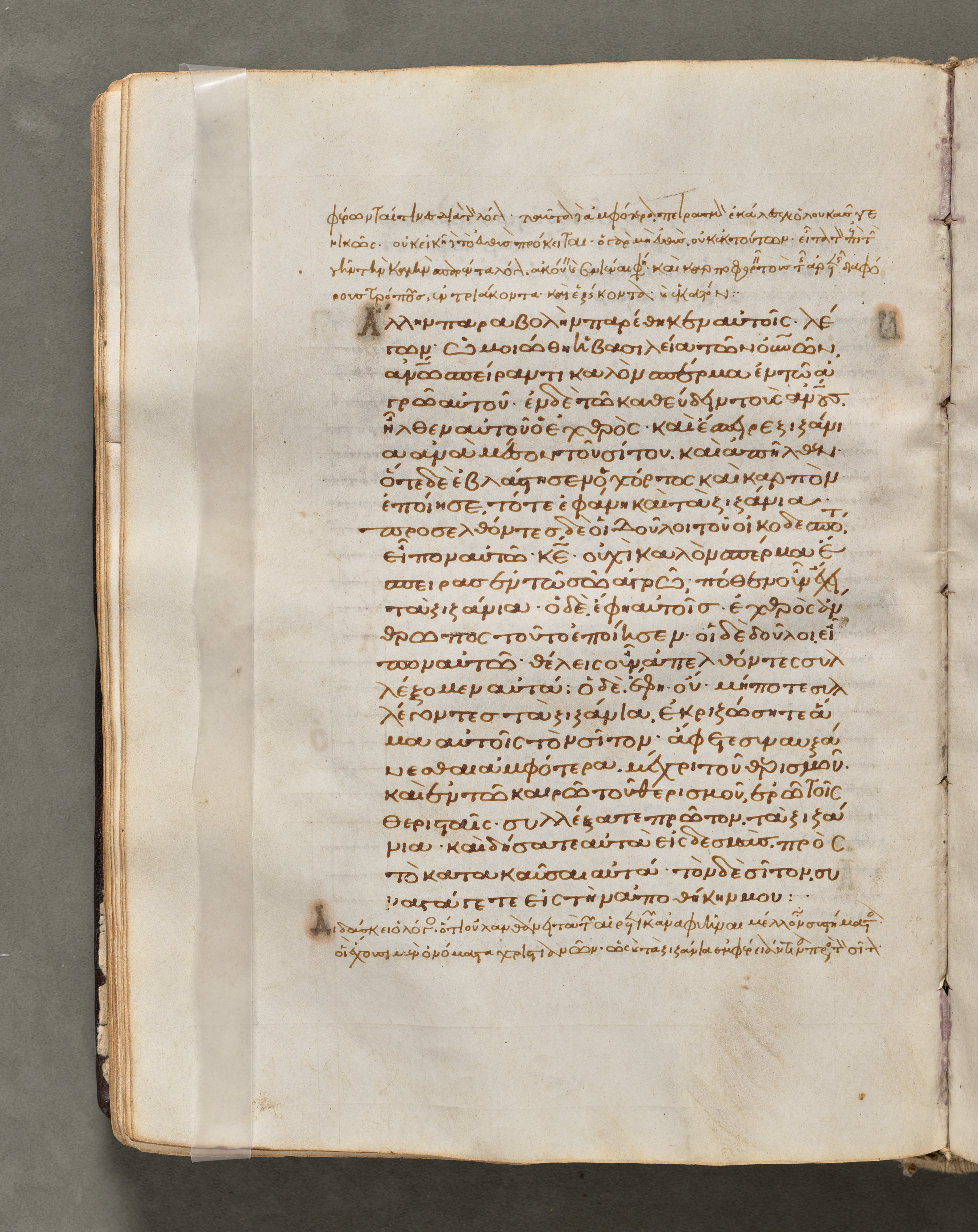 Open book with yellowed pages on a gray background. The book's cover is not visible. The left page is blank, with a strip of clear tape down the middle. The right page displays brown text in a language that appears to be Greek, written in a flowing script. The text is densely packed and fills most of the page. The page edges are worn and browned, with darker brown spots scattered throughout. A vertical seam runs down the center of the book, with stitching visible on the right side. The pages are slightly curved.