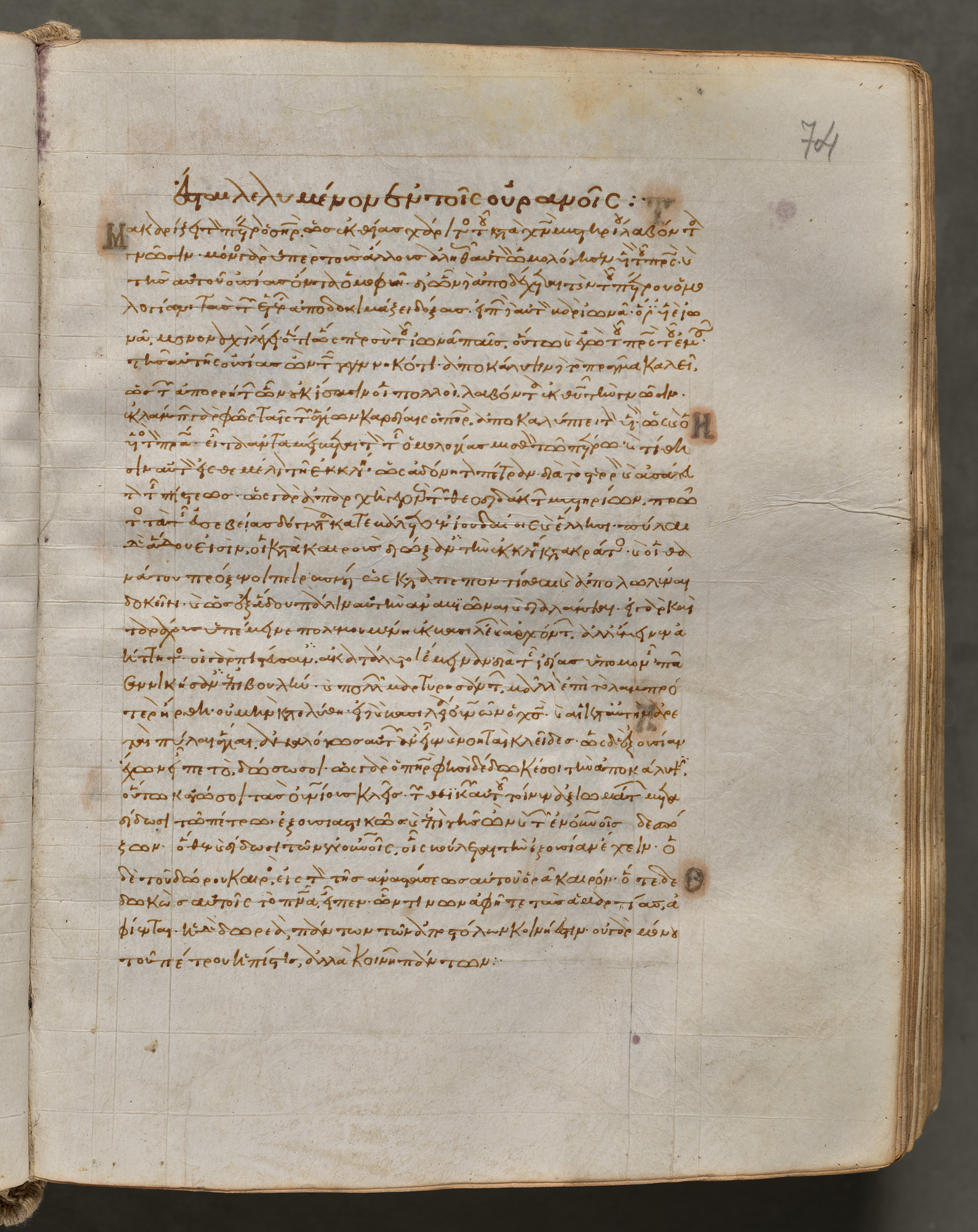 Open book with yellowed pages, brown ink text in a foreign language, possibly Greek, written in a flowing script. The page number "74" is visible in the top-right corner. The text is divided into sections with varying line lengths; some lines are longer than others. Darker brown spots and discoloration are present on the page. A grid pattern is faintly visible, with lines drawn in a darker color. The book's edges are worn, with rough, uneven surfaces. The background behind the book is dark gray. The image presents a page from a Gospel Book with Commentaries.