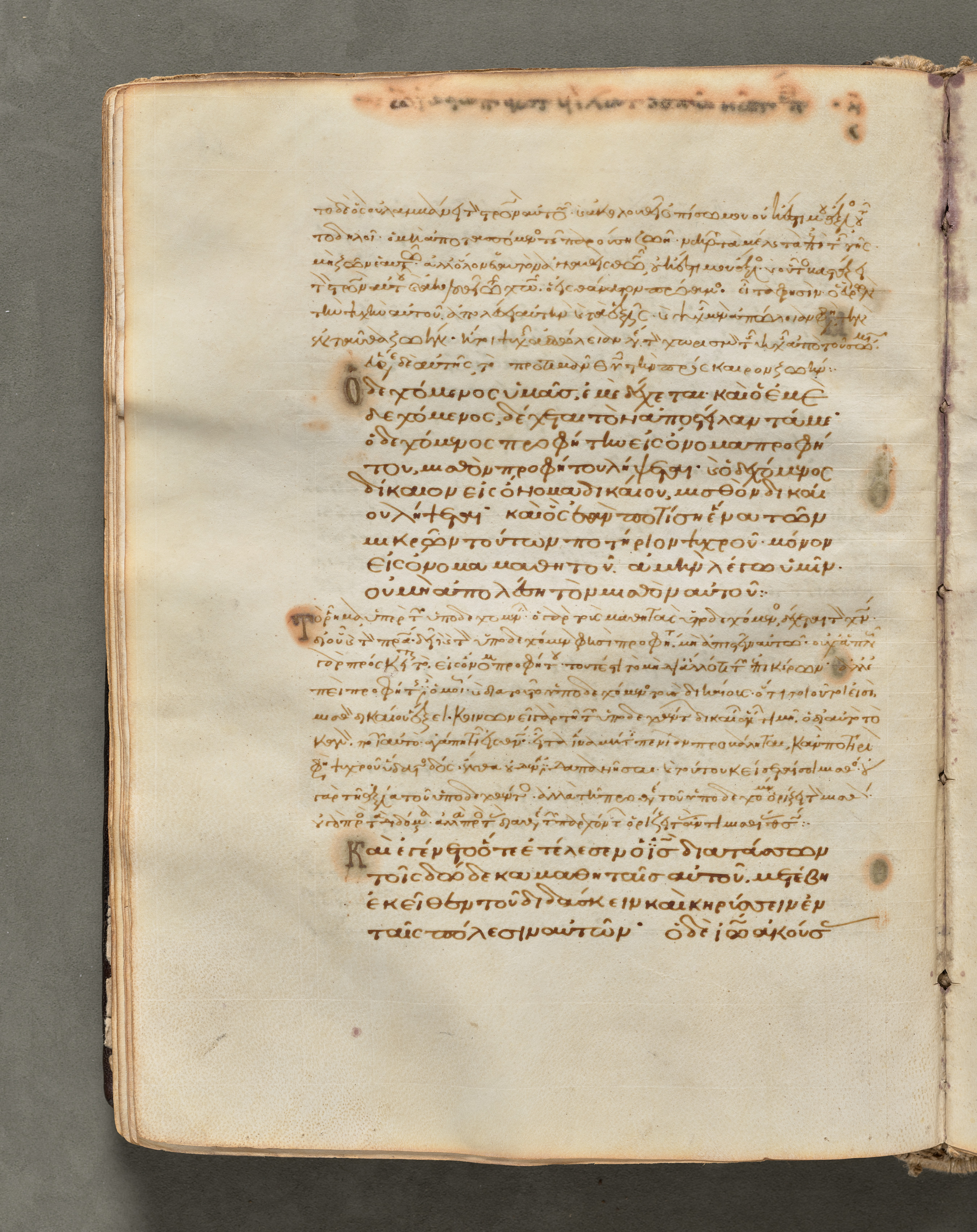Light brown, yellowed book page with darker brown discoloration around edges; brown ink; Greek text; written in a manuscript style; verso; stains; old paper; worn edges. Text, folio 46 (verso), from a Gospel Book with Commentaries.