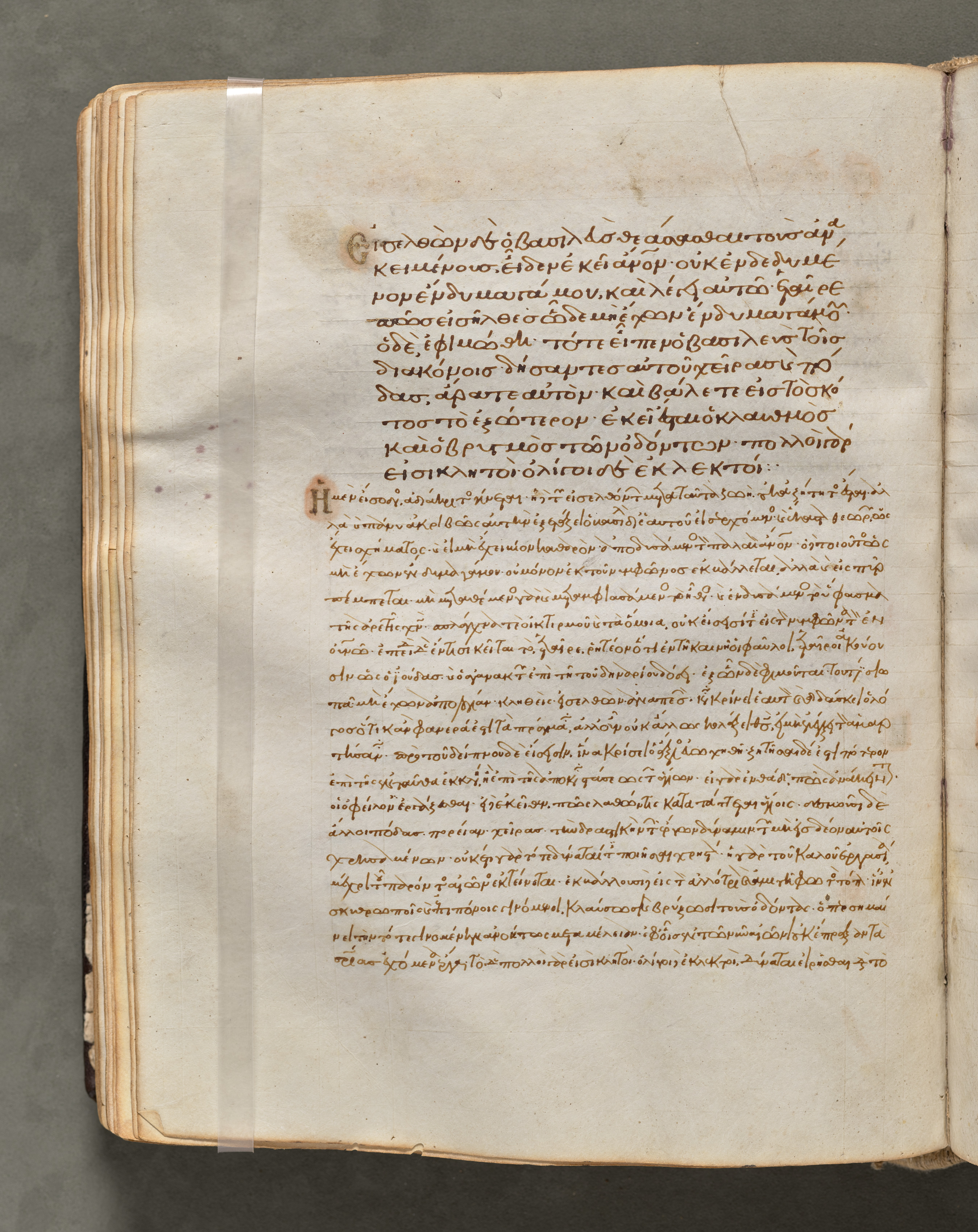 Open book with yellowed pages on a gray surface. The book is bound on the left side. A strip of clear tape runs vertically down the left side. The pages are filled with handwritten text in brown ink. The text is written in an ancient language, possibly Greek. The handwriting is in a flowing script. The book is open to a page with a large block of text. The page on the right has a heading in larger text. The background is a plain gray surface.