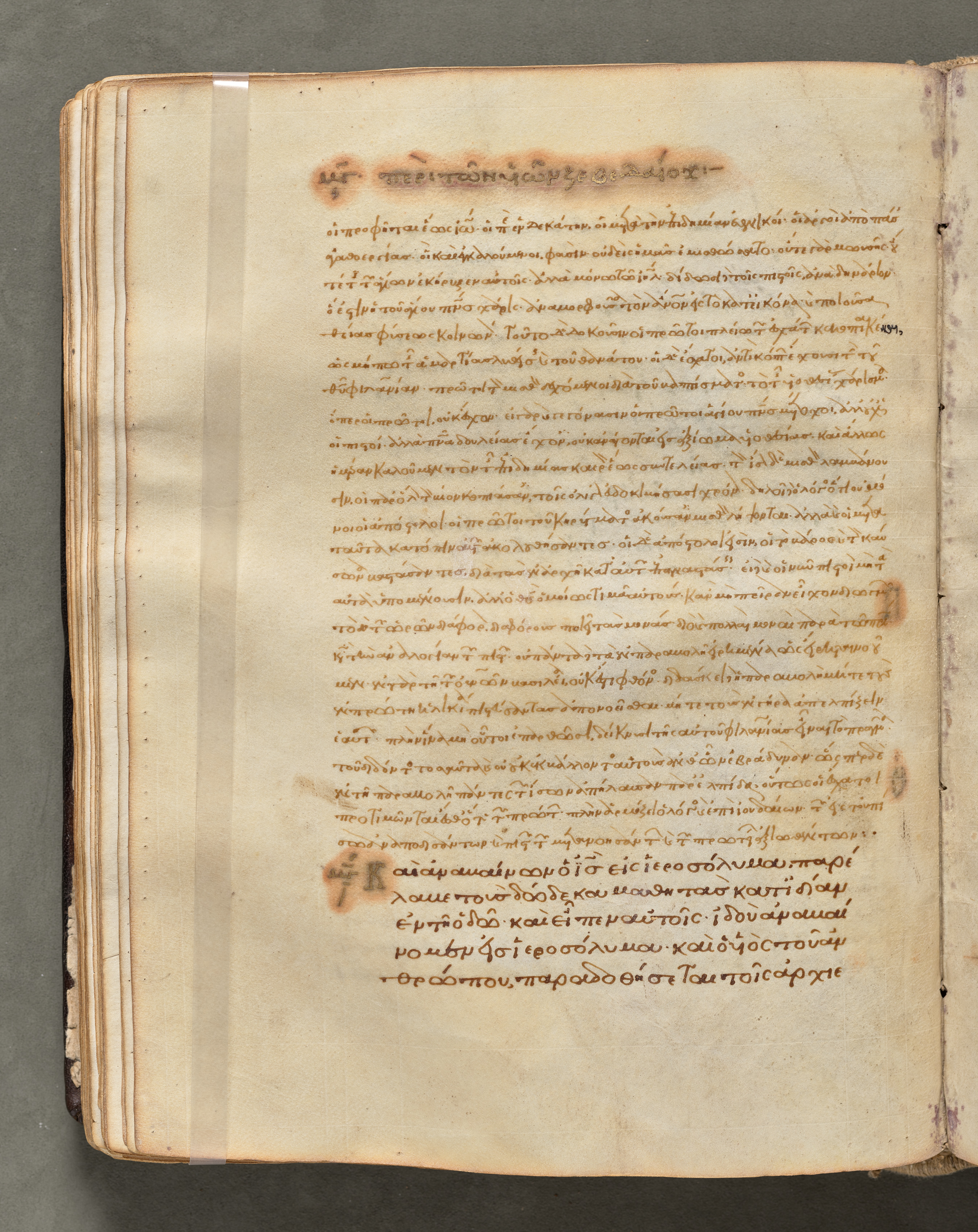 Yellowed, aged, parchment page from a Gospel Book with Commentaries; brown ink; Greek text; right-hand page; visible stitching along spine; clear protective strip; dark spots; stains; discoloration; grey background.