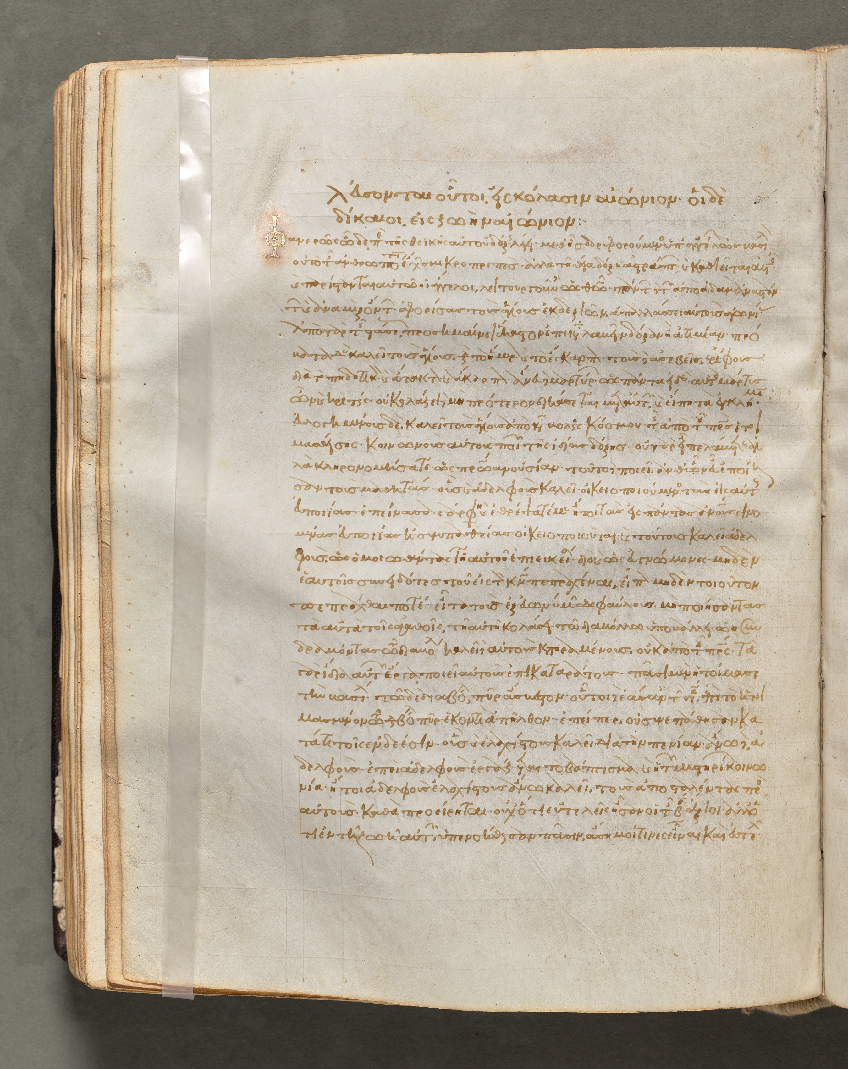 An open book with yellowed pages and brown writing, likely in Greek. A piece of clear tape runs vertically along the left edge, securing the pages. The book rests on a dark gray surface. The handwriting on the page appears to be cursive and covers most of the page. The page on the left appears to be blank. The text is written in gold ink. The book's cover is not visible. The image shows a verso page.