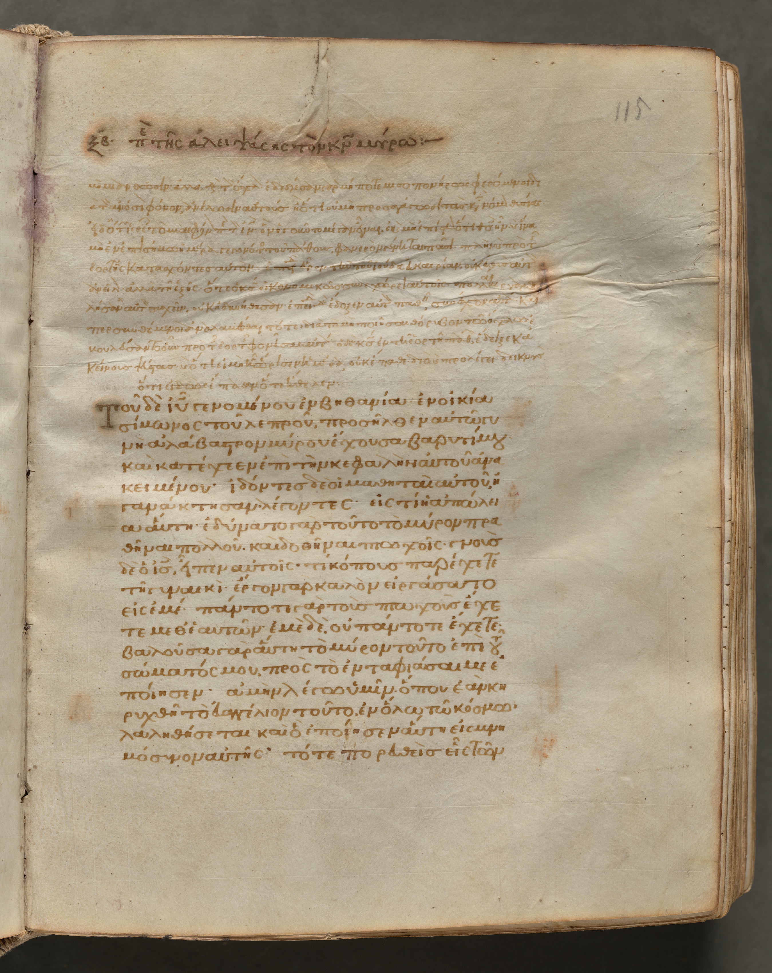 Yellowed, aged book page with dark brown text written in a foreign language, possibly Greek. The page number 115 is written in the top right corner. The page has a crease down the middle and shows signs of wear, including dark brown spots and discoloration around the edges. The text is written in a flowing script with some words or letters larger than others. The page appears to be from an old book or manuscript.