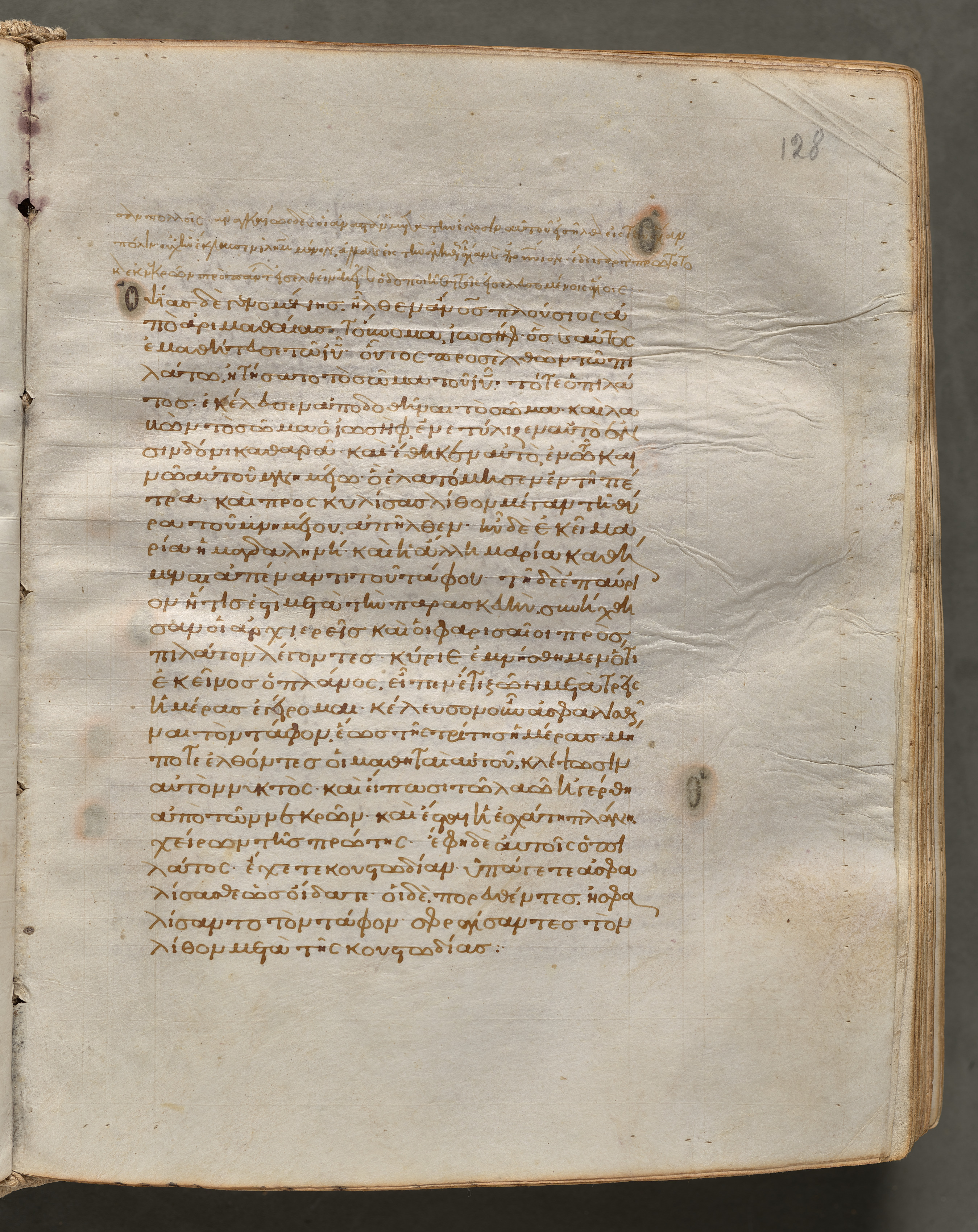 Yellowed, aged parchment with darker edges and burnt spots. Two holes on either side with stitching through them on left side. Number "128" written in blue in upper right corner. Text written in gold ink. Text written in cursive. The text is in Greek. The text consists of 31 lines. The background is dark gray.