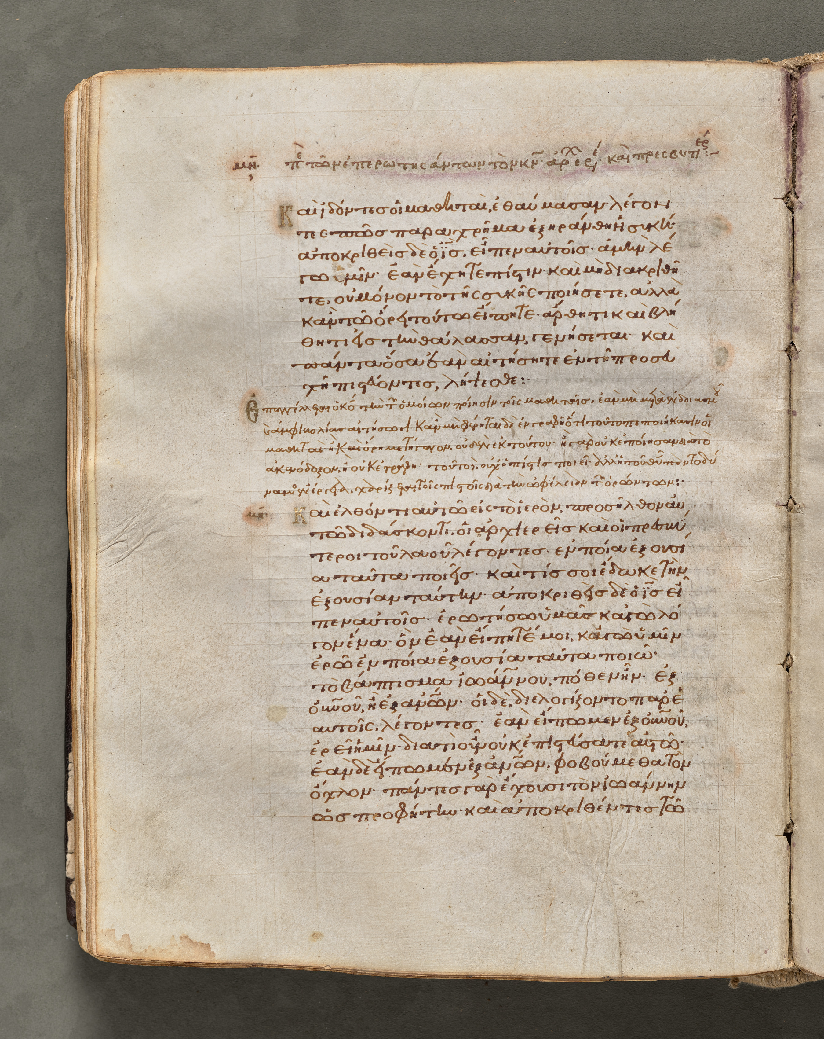 A yellowed page with aged edges and darker brown edges on the left and bottom; darker brown discoloration on the right edge. A vertical line down the center; another vertical line on the right with diamond shaped stitching; the right edge has dark brown discoloration. A fold in the paper on the left; stains; dark brown spots; paper discoloration; lines; writing; Greek text; brown ink; a large blank space on the right edge.
