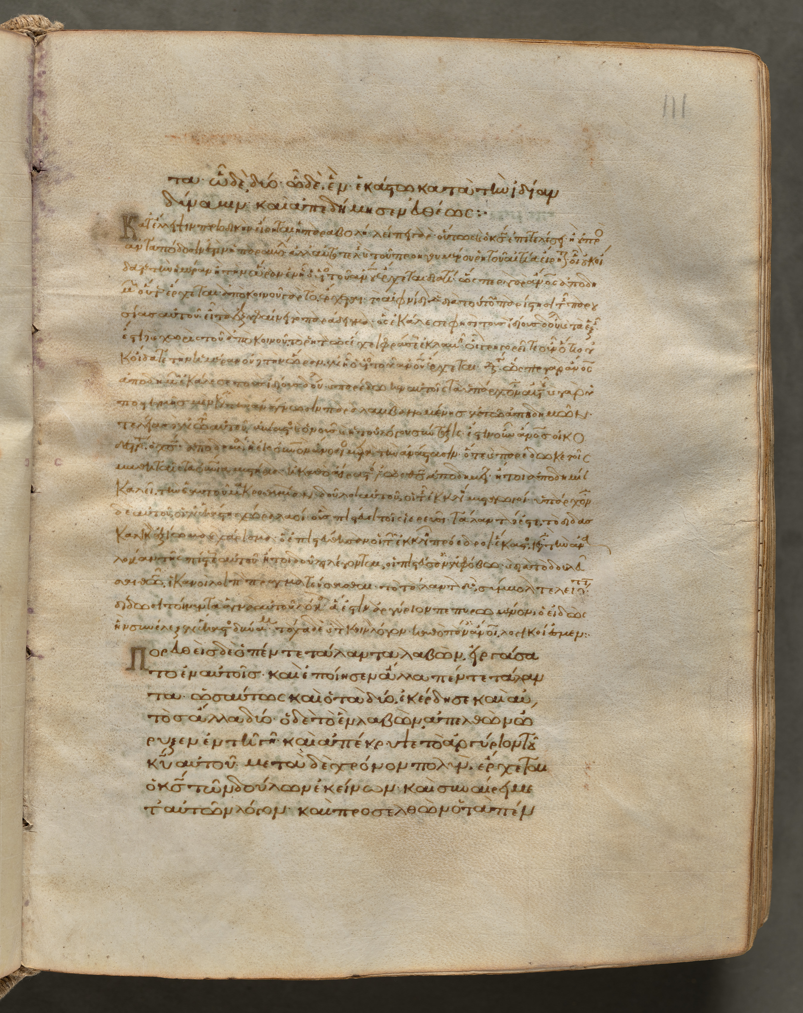 Text, folio 111 recto, from a Gospel Book with Commentaries by an unknown artist. The image shows an open book with yellowed pages. The page shown has a number in the top right corner. The page is filled with handwritten text in a language that appears to be Greek. The text is written in gold ink and consists of multiple paragraphs. The handwriting is cursive and ornate. The page has a worn and aged appearance, with visible signs of wear and tear, including stains, discoloration, and rough edges. The book appears to be bound in a simple cover. The background of the image is dark gray.