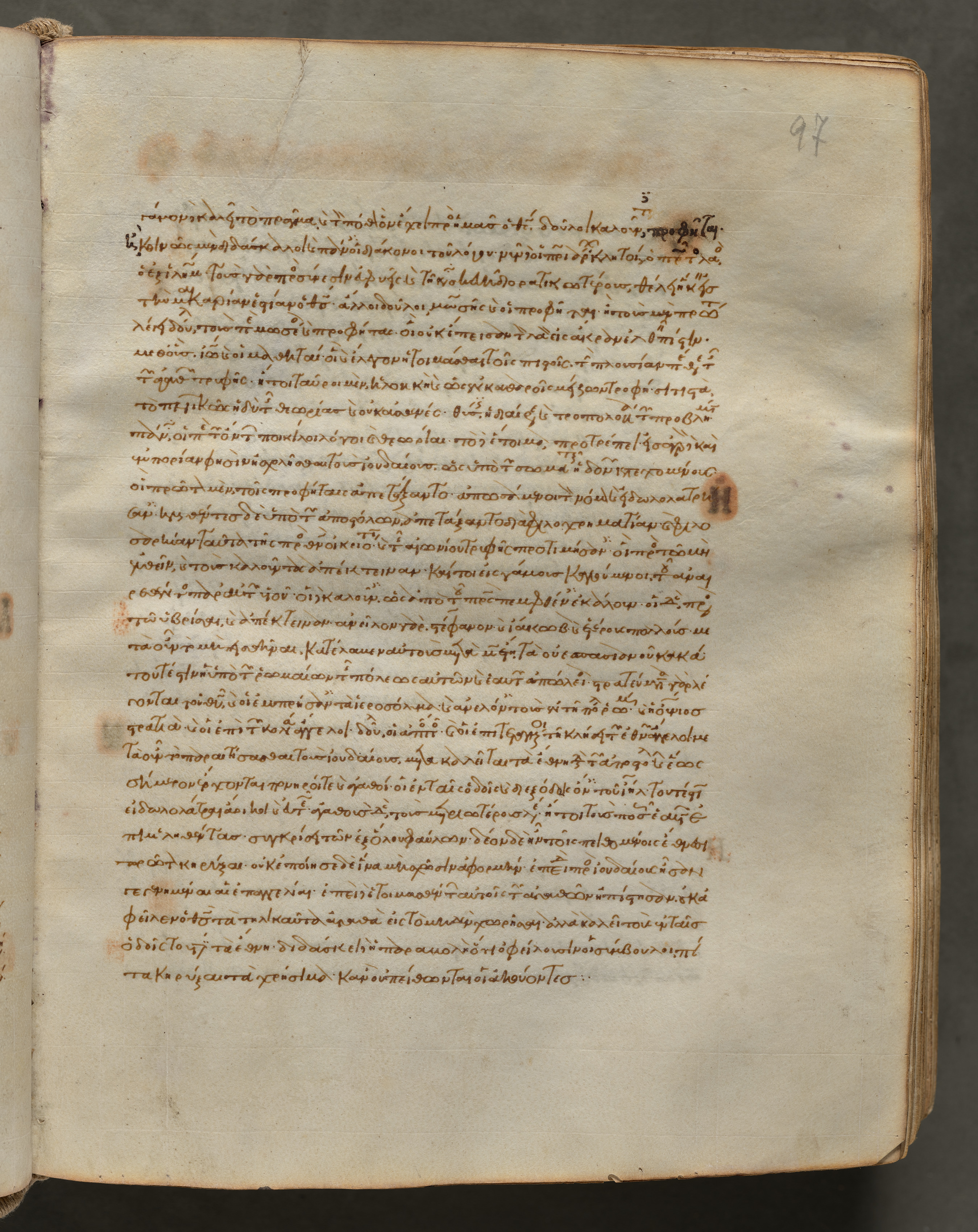 Open book with yellowed pages. One page shown with a pencil number '97' in top right corner. The page has Greek handwritten text in brown ink. There are darker brown spots and stains on the page. The edges of the pages are rough and worn. The page is set against a dark grey background.