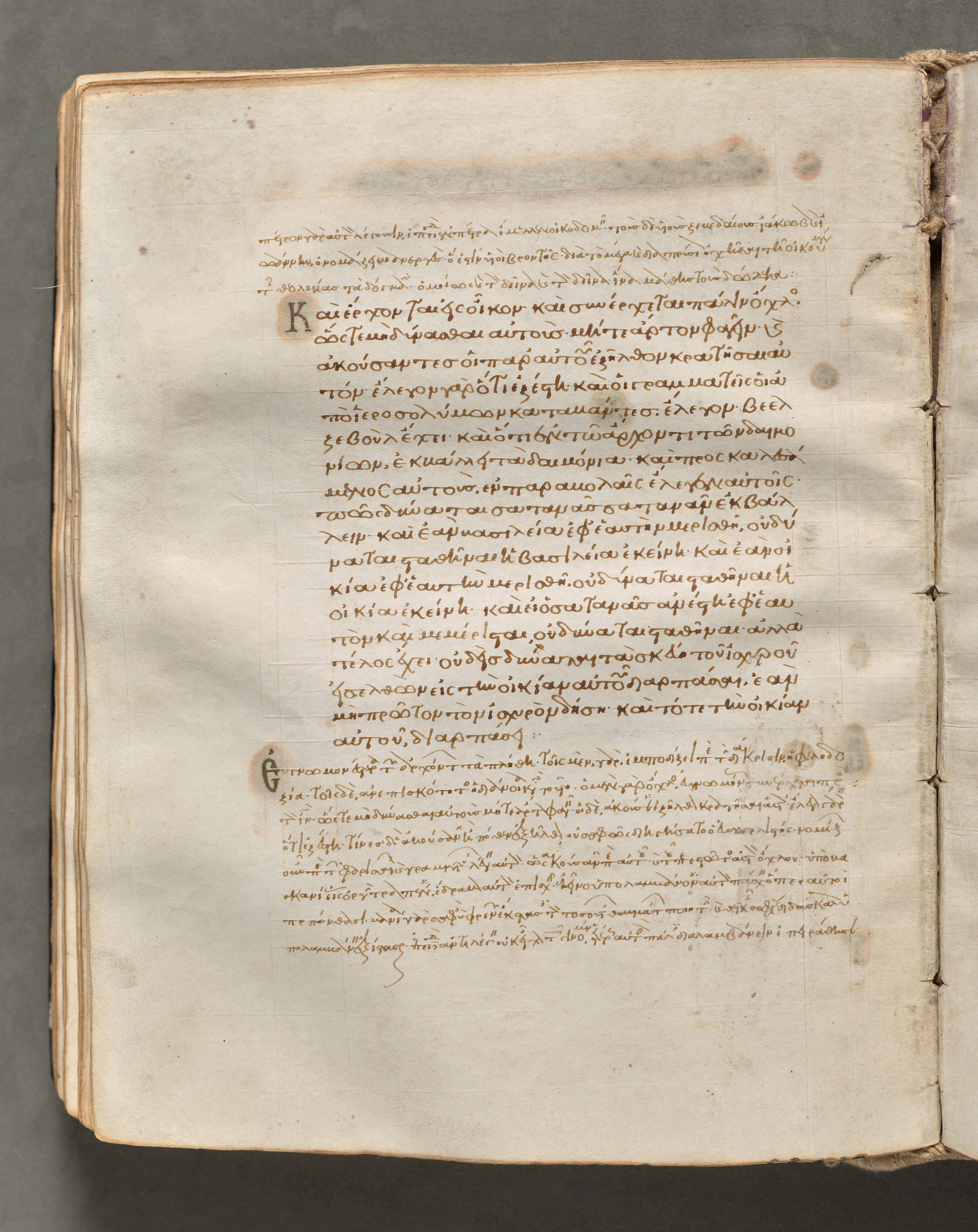 The image shows an open book with yellowed pages. The left page is fully visible and the right page is partially visible. The book is open to a page with text written in brown ink. The text is in a language that appears to be Greek. The text is written in a formal, cursive script. The page has a rough, aged appearance with darker spots and discoloration throughout. The edges of the pages are worn and rough. The book appears to be old and possibly handmade. The background of the image is a solid gray color.