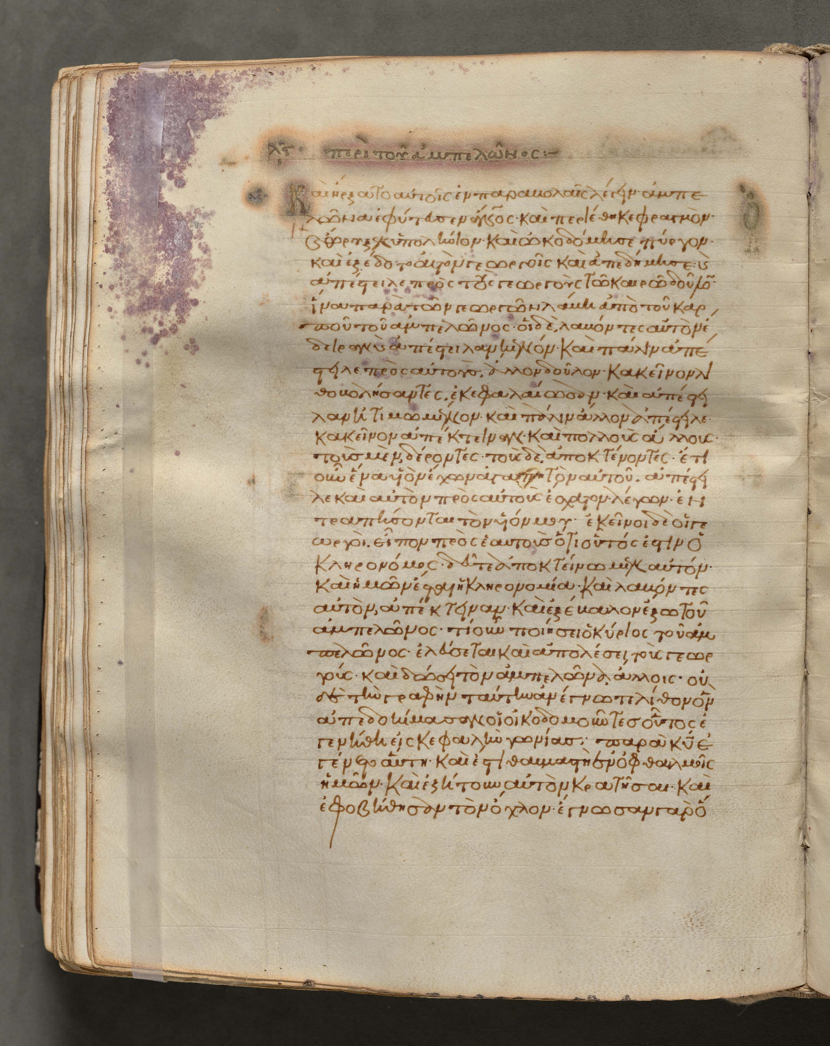 The image shows a yellowed, aged book with a page open to a text written in brown ink. The book's pages are yellowed and worn, with visible signs of aging and use. The left side of the page has a darker purple discoloration. The text on the page is written in a language that appears to be Greek. The text is written in a flowing script, with no images or illustrations on the page. The background of the image is a dark gray color. The book appears to be old and possibly valuable. The book is open to a single page with writing on it. The page on the left of the image is blank. The book's cover is not visible. The book is bound on the left side.