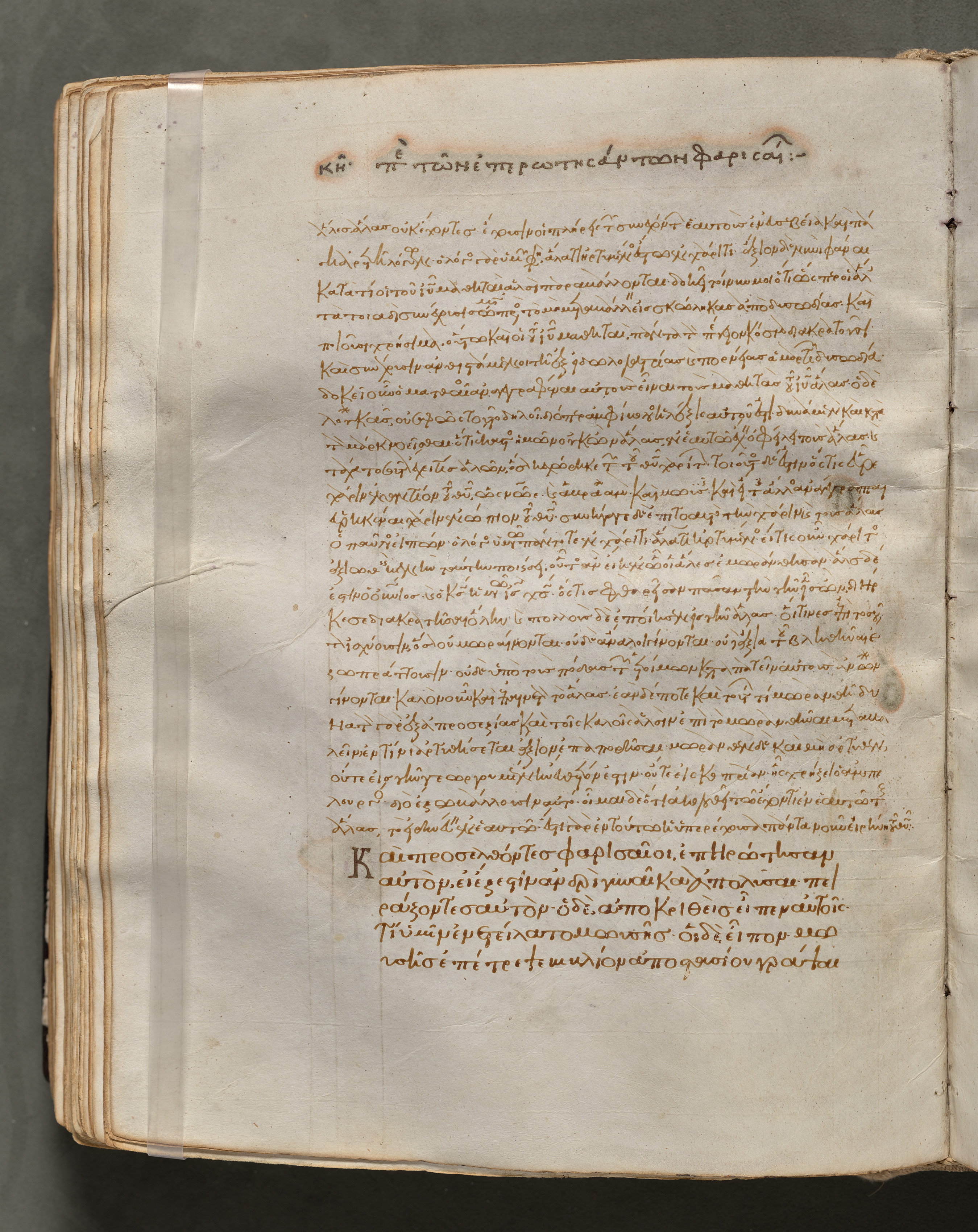 Open book with yellowed pages, featuring handwritten text in brown ink, written in a language that appears to be Greek. The text is arranged in paragraphs with some sections written in a larger font size. A clear tape strip is on the left side of the page. The book's cover is not visible, but the pages are slightly worn and have darker edges. The background behind the book is gray.
