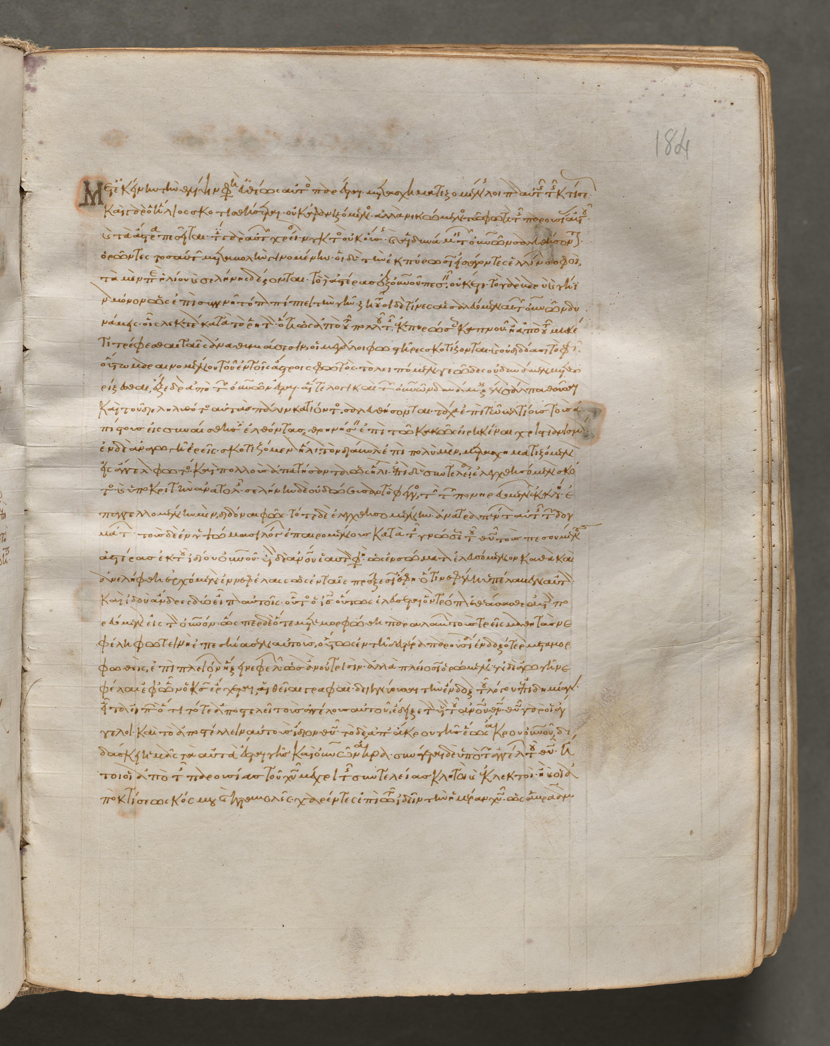 A Gospel Book with Commentaries, folio 184 (recto) shows an open book with yellowed pages. The page displays handwritten text in a language that appears to be Greek. The text is written in brown ink and features a large decorative letter "M" at the top left corner. The page number "184" is visible in the top right corner. The book's pages exhibit signs of aging, with darker spots and discoloration around the edges. The book lies open on a dark gray surface, with the right side of the book slightly raised.