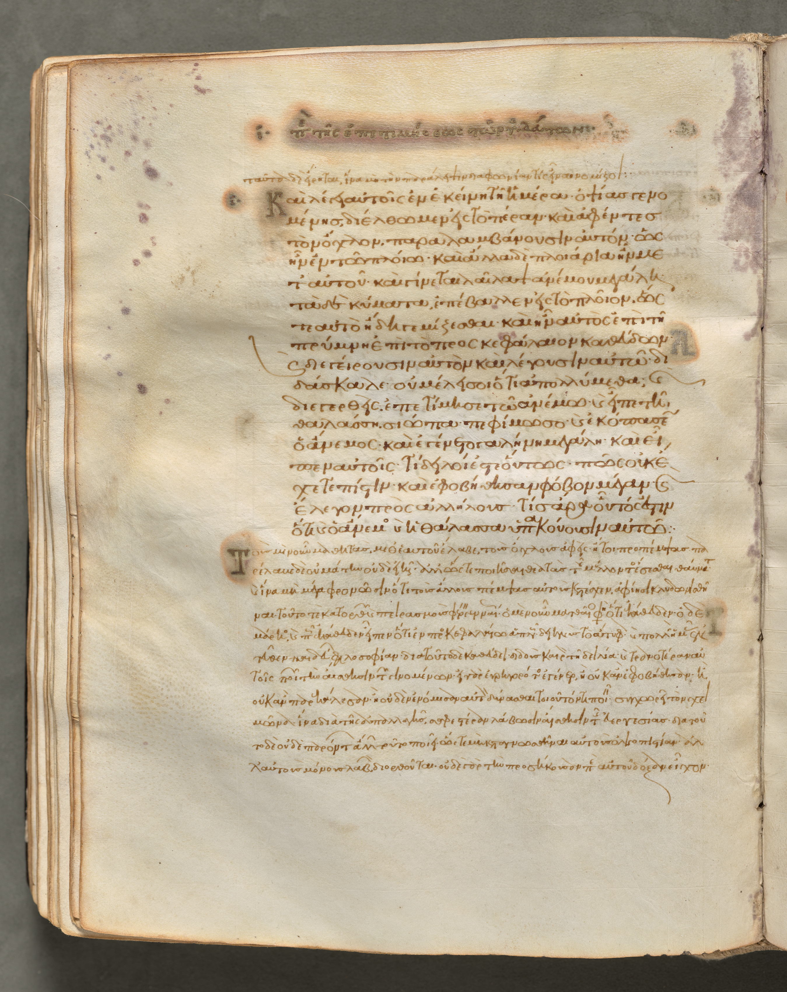 Parchment page with brown ink writing in Greek, arranged in two columns and multiple lines of text. The top of the page has a slightly darker line of text and two horizontal ink lines above and below it. The parchment is stained with dark spots and has a rough, aged appearance. The edges of the page are worn and torn in places. The left side of the page has a series of stacked, folded pages extending from it. The background behind the page is gray. Gospel Book with Commentaries.