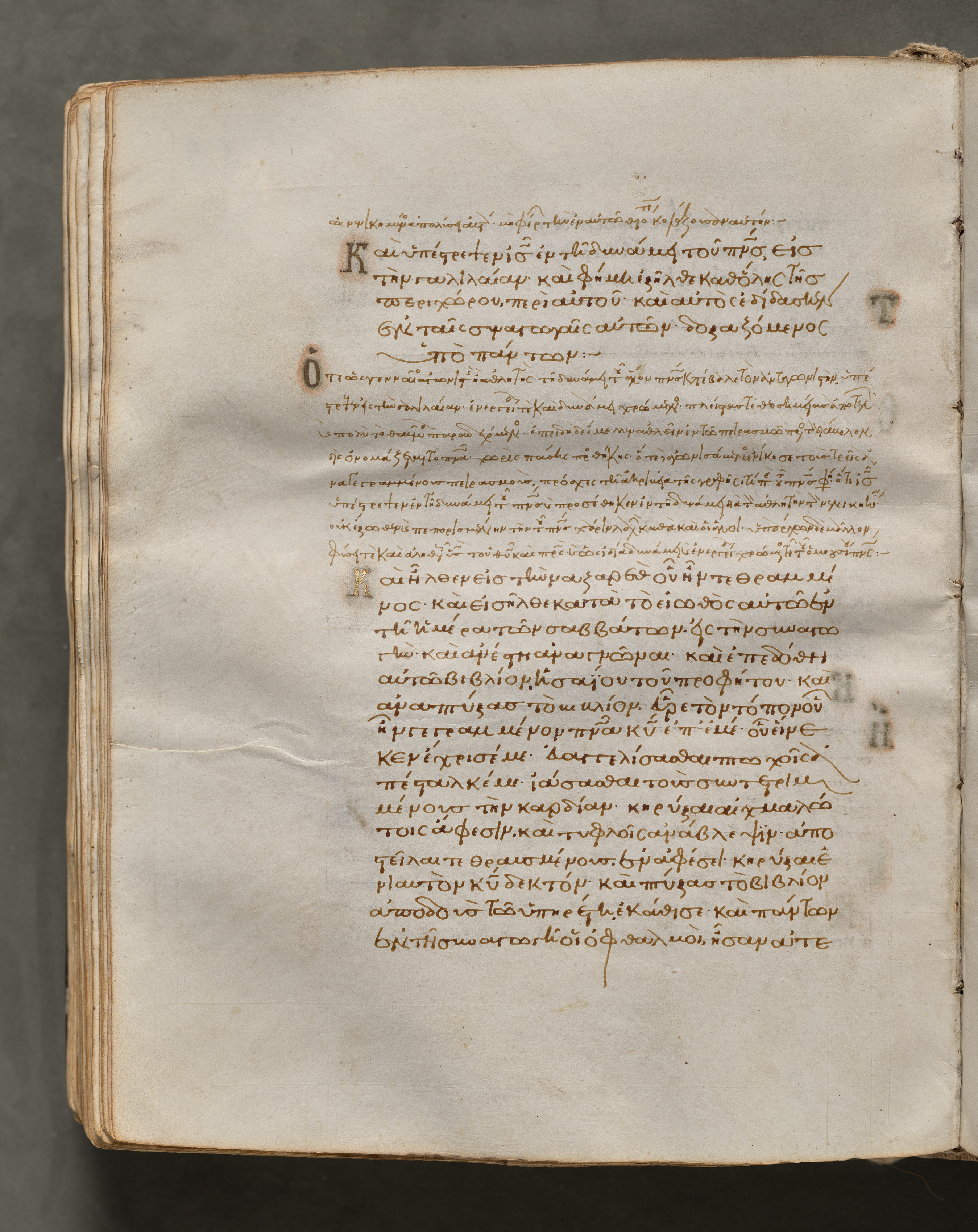 A book with yellowed pages lies open to a double-page spread. The image shows the verso side of a folio. The page displays brown text written in an ancient Greek script. The text fills the page with no illustrations or images. The book appears old and worn. The background behind the book appears dark gray. A shadow surrounds the book's edges.