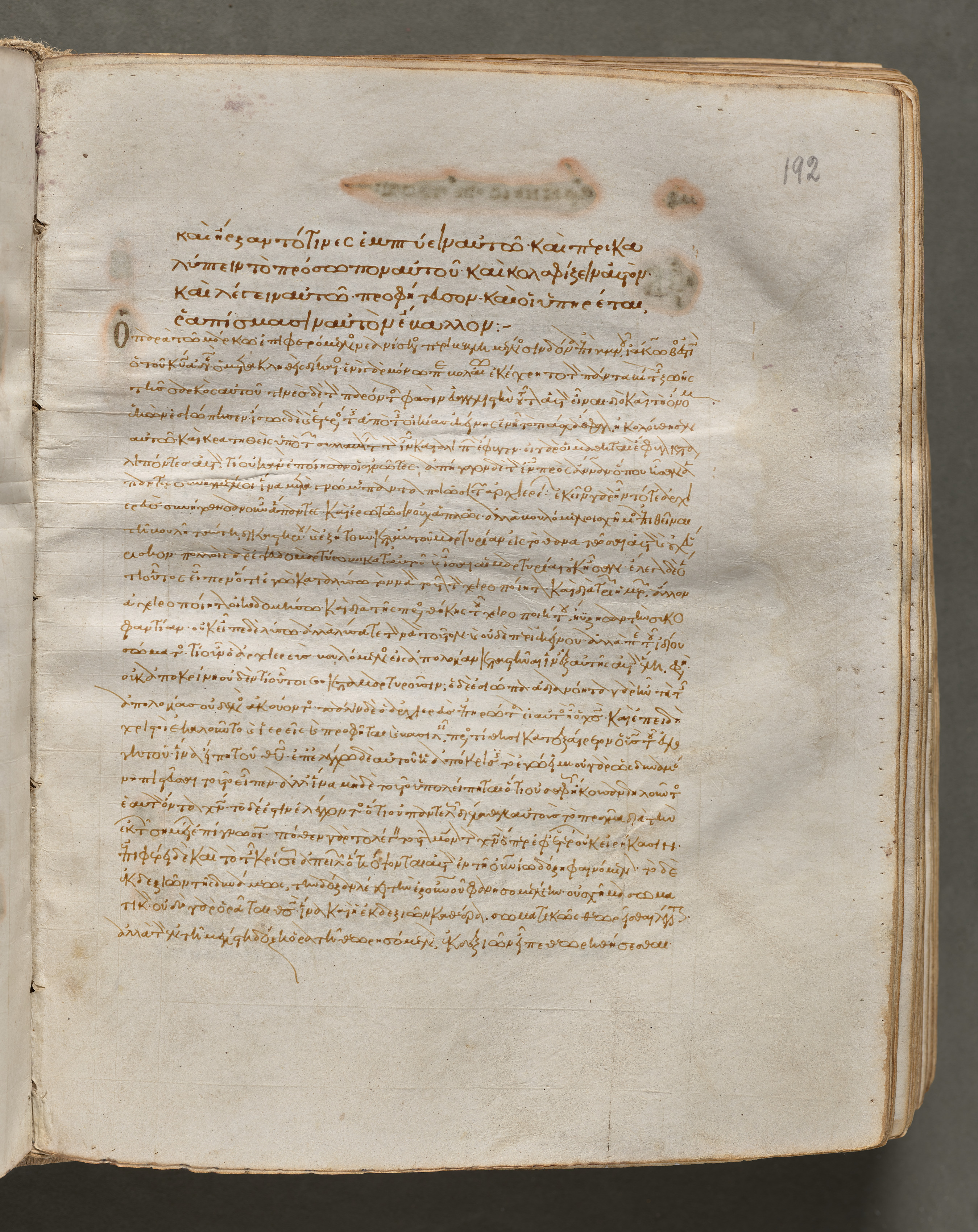 Open book with yellowed pages, worn edges, and brown ink text. The page number "192" is handwritten in pencil at the top right corner. The text is written in an ancient language, likely Greek, in a flowing script. The book appears to be old and worn, with visible signs of aging such as discoloration, stains, and rough texture. The pages are turned down slightly at the corners, and the book is set against a dark gray background. Brown ink blotches and darker brown discoloration are around the top third of the page. A small oval-shaped darker stain is on the top center of the page.
