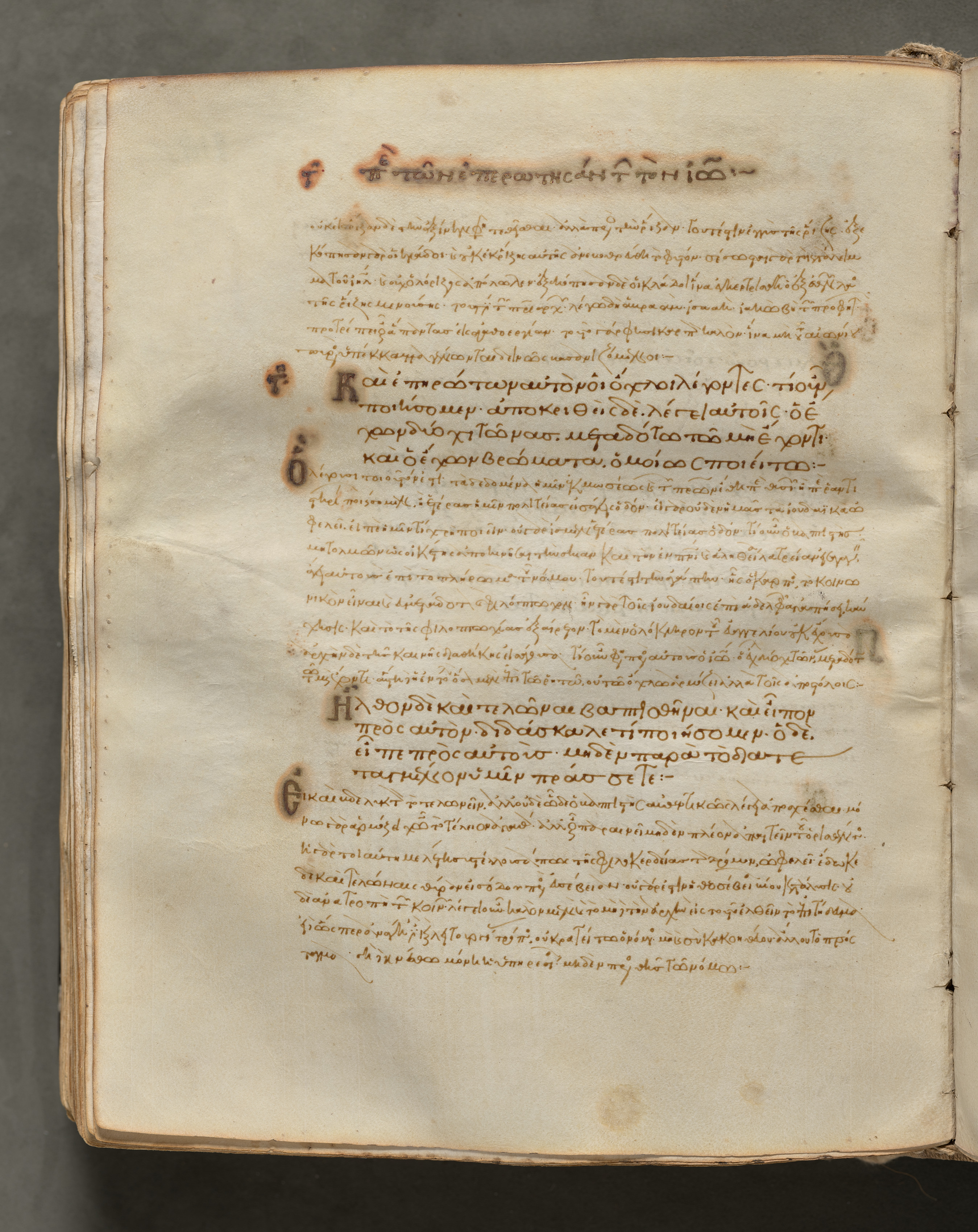 Yellowed parchment page with text written in brown ink, featuring Greek script; page has darker brown stains; visible stitching along edges; top and bottom edges are rough and frayed; dark background. Gospel Book with Commentaries.