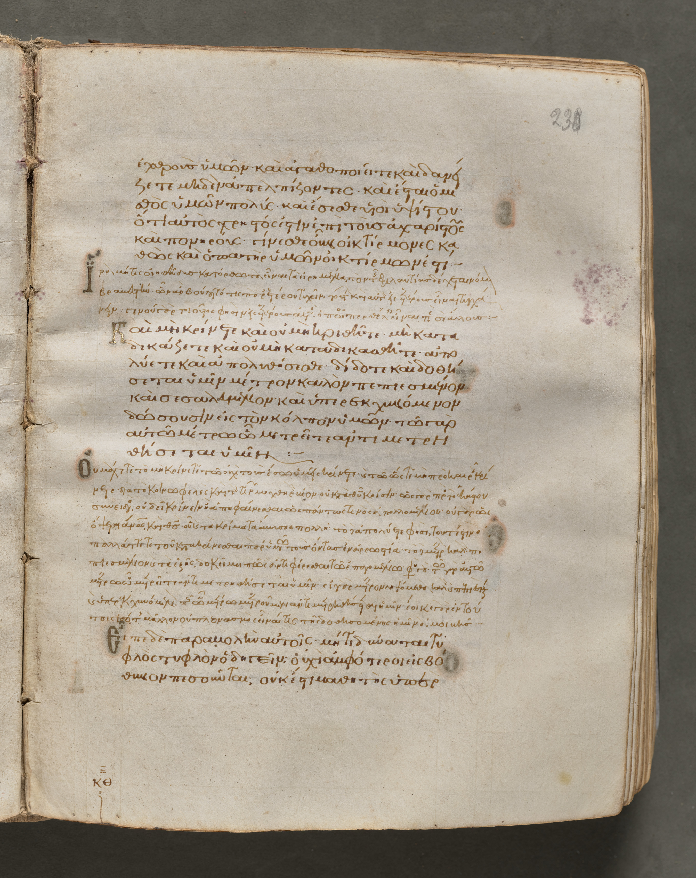 Open book with yellowed pages, brown ink text in a language that appears to be Greek. The book is bound with visible stitching along the spine. The page number 230 is written in the upper right corner. The text is written in a flowing script and appears to be in a single column. The book is lying flat on a dark gray surface, with the left page edge visible.