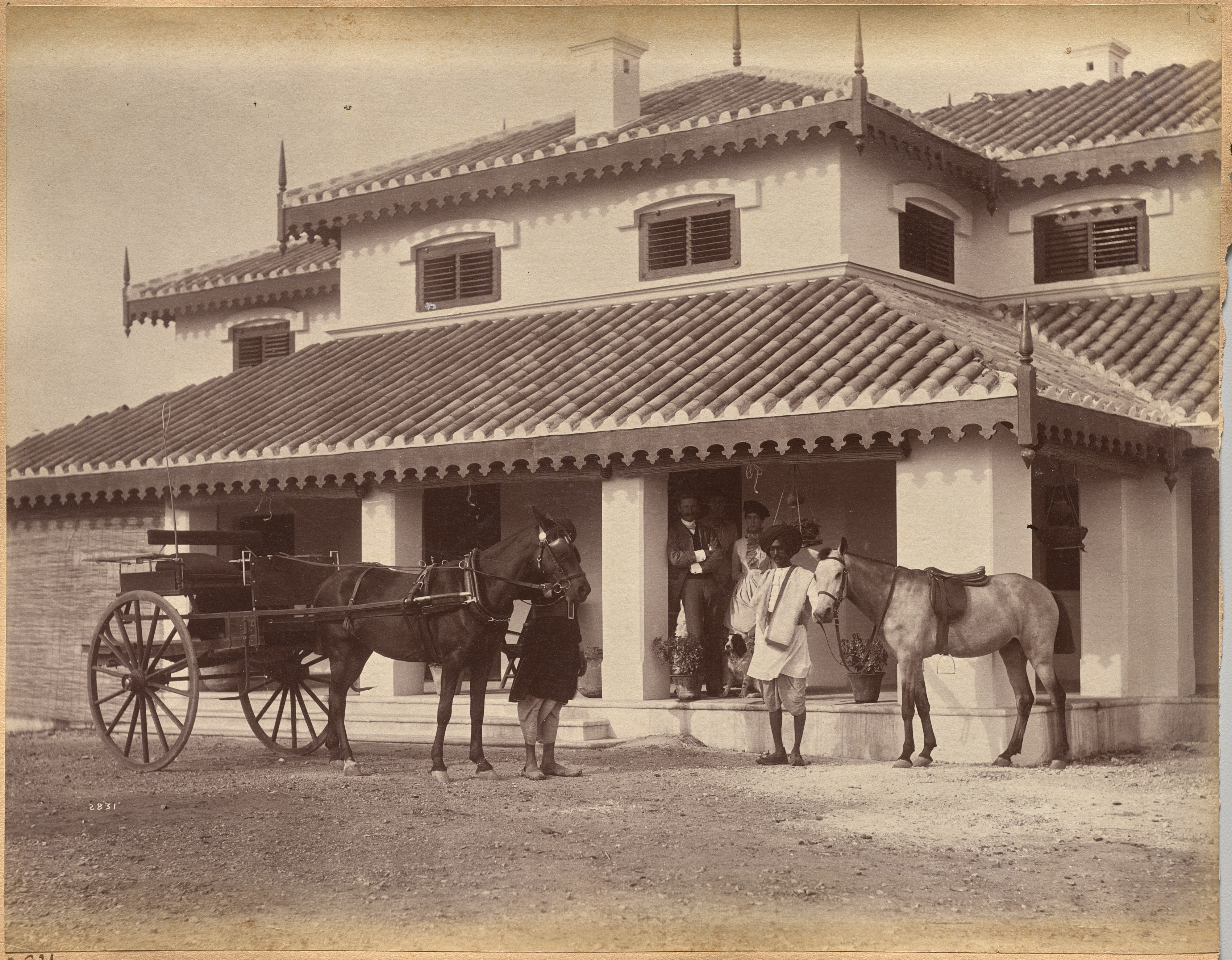 Sepia-toned photograph. Two-story building with white walls, dark roof tiles, and a covered porch supported by columns. Four men standing on the porch. A horse-drawn cart with a dark horse on the left. A man wearing a loincloth standing next to the horse. A man wearing a white robe standing next to a light-colored horse with a saddle on the right. The building has multiple windows with shutters and small decorative elements on the roof. The foreground is a dirt road.