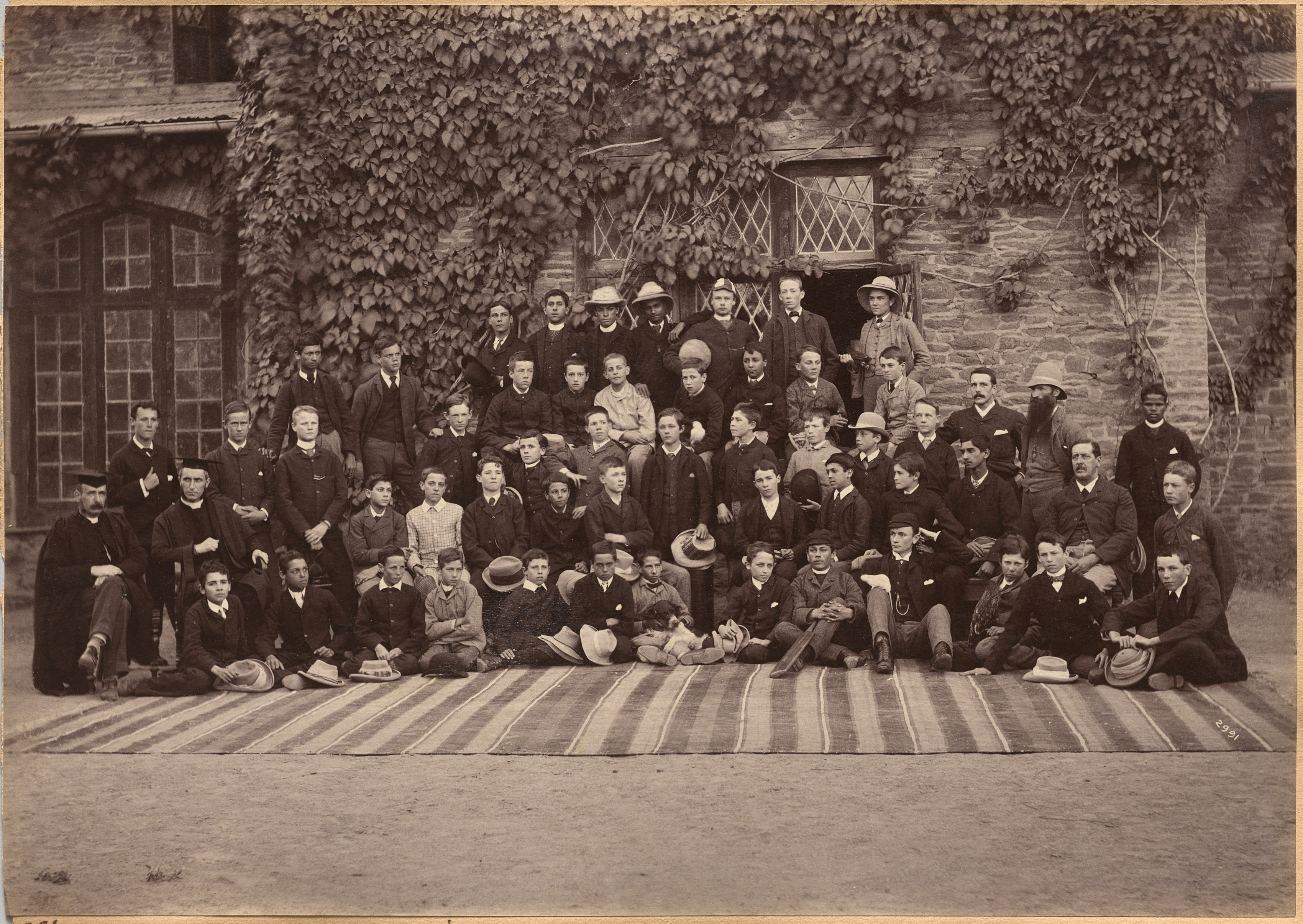 Black and white photograph of a large group of people, men, boys, and a few adults, sitting and standing on a striped rug outside a brick building. The group consists of approximately 50 individuals. The building behind them has two large windows on the left and a smaller window on the right. A vine grows up the right side of the building. Most of the people are wearing dark clothing, with some wearing hats. The people are arranged in several rows, with the front row sitting on the ground and the others standing or sitting behind them. The background features a stone wall with a doorway and windows.
