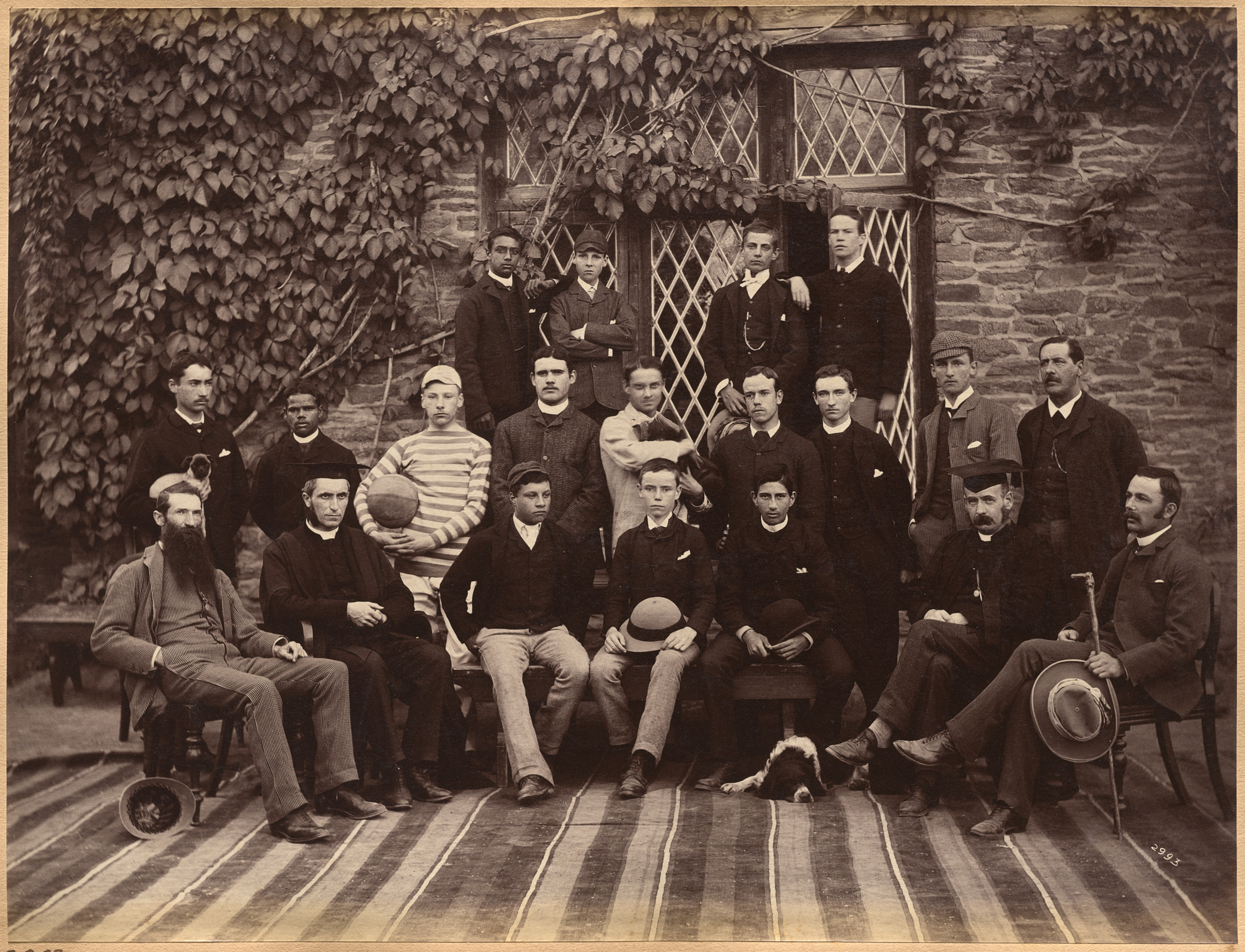 Black and white photograph of a group of people. Men and boys, total 18, posed in three rows. Back row, seven men and boys standing. Middle row, five seated on a bench. Front row, six seated in chairs. A dog sits on the floor between the middle and front rows. They are on a striped rug. The background includes a brick wall with lattice windows and leafy vines. The men wear suits; some hold hats. The boys wear school uniforms. The photo is old with a sepia tone and thin gold border.
