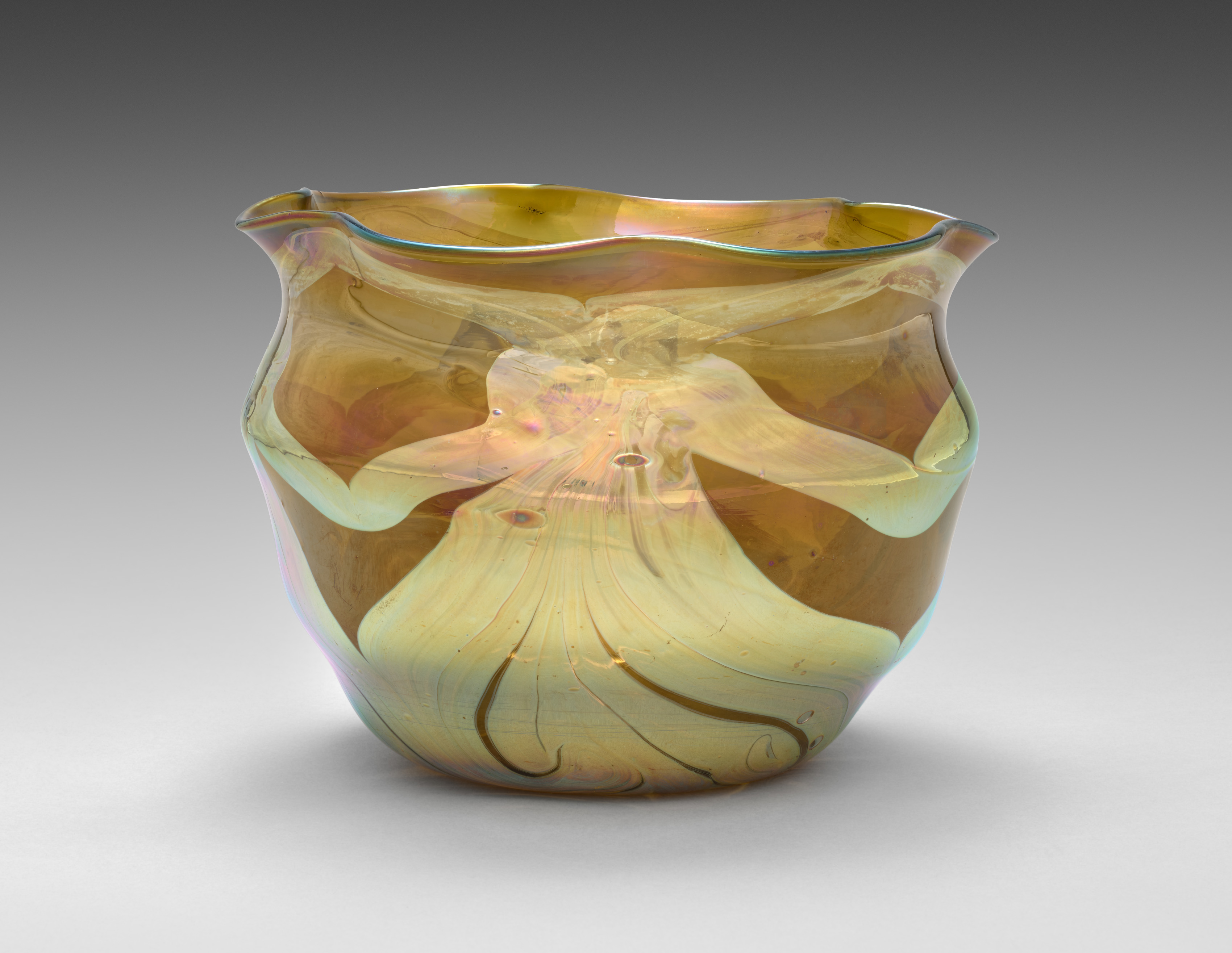 Bowl by Tiffany Glass & Decorating Company. The image shows a glass bowl with a wavy rim and a rounded body. The bowl is primarily yellow with shades of brown and pink throughout. The glass appears to have an iridescent sheen. The bowl has a wide mouth and a narrow base. The background is a gradient from dark gray at the top to light gray at the bottom. The bowl casts a shadow on the surface below it.