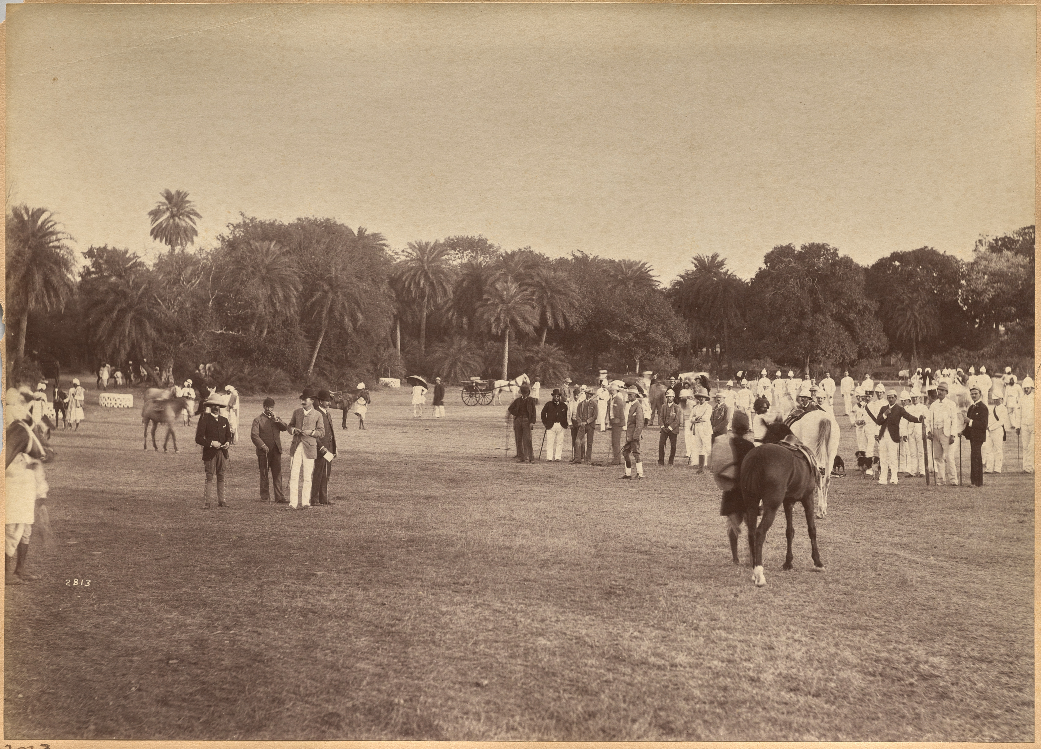 Sepia-toned photograph. A grassy field with people standing around. A person on a dark-colored horse in the foreground faces right. A line of people in white outfits on the right. Trees in the background. Palm trees among other trees. Several horse riders in the distance. A few people on horseback wearing white. People are wearing hats. Some people are in dark outfits. A man on the left wears a light-colored turban. A man in a white suit on the right. Other people are wearing turbans. The sky is clear.