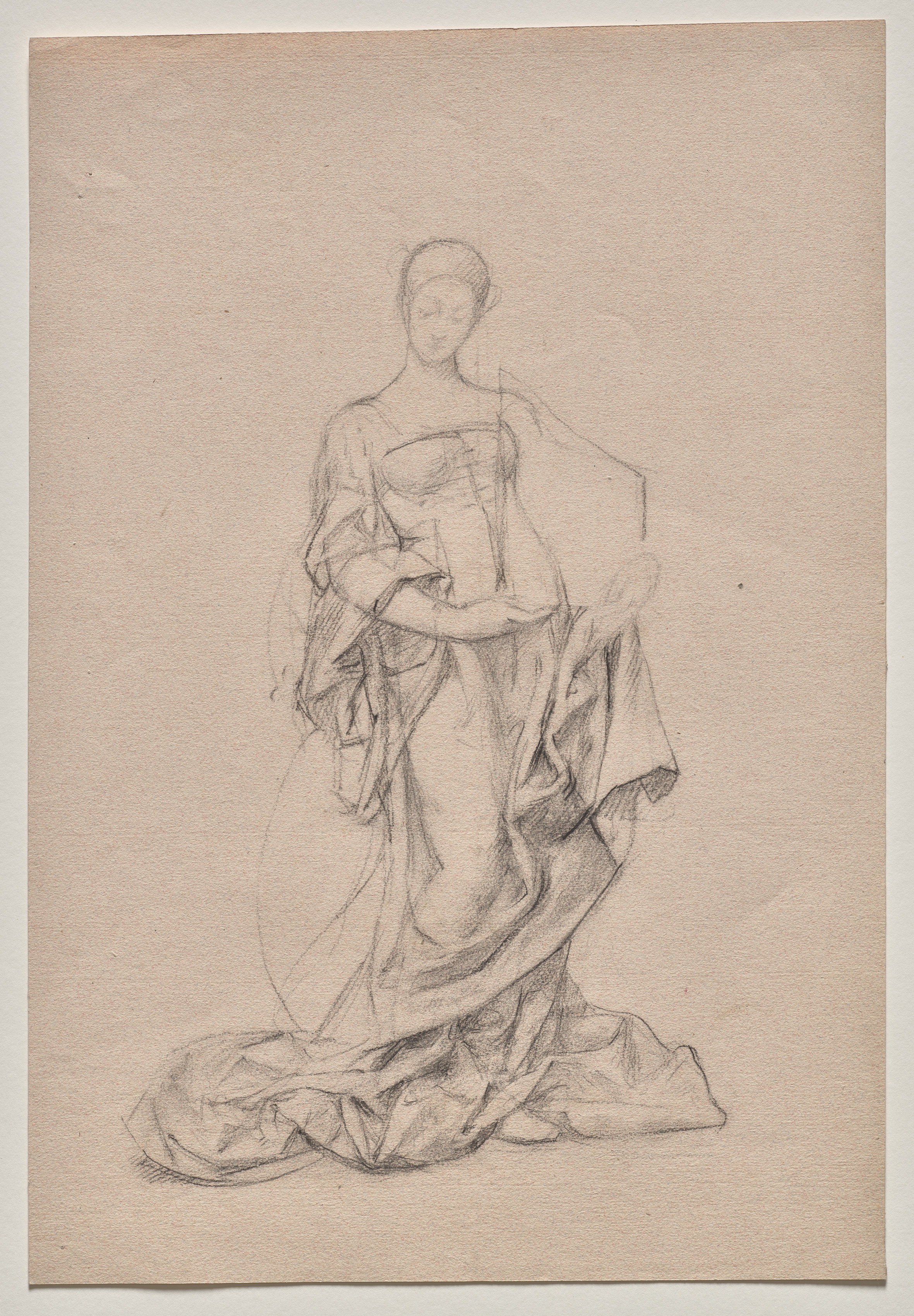 The image depicts a pencil drawing on light brown paper. The drawing is of a woman wearing a dress, standing and looking straight ahead. The woman's hair is pulled back and covered. The dress has a low neckline and puffy sleeves. The dress appears to be flowing and has folds and creases that are depicted through various shading techniques. The dress also appears to be gathered or ruffled at the bottom. The background of the drawing is plain and light brown. The drawing appears to be titled, "Architecture" and is by Marie Bracquemond.