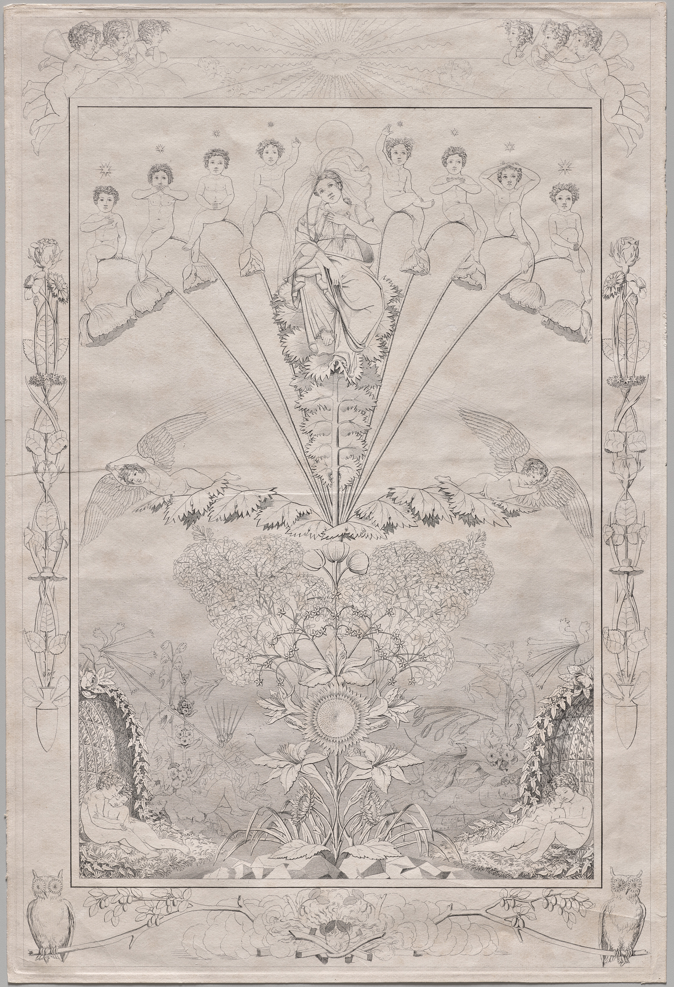 The artwork, titled "Night" by Philipp Otto Runge, features a black and white drawing on a light gray background. The drawing is framed by a thin black line and an outer decorative border. The top section depicts a central figure of a woman surrounded by four pairs of cherubs, each pair positioned on a curved element resembling a seed pod or leaf, with four additional cherubs in the corners. The bottom section shows a landscape with two reclining human figures on either side. The center of the artwork features a large flower-like element with a sun at its base and a tree-like structure rising above it. The border includes drawings of flowers, leaves, and two owls in the bottom corners, with another owl perched on a plant in the left corner and a similar depiction on the right. Two birds are flying on either side of the central flower-like element.