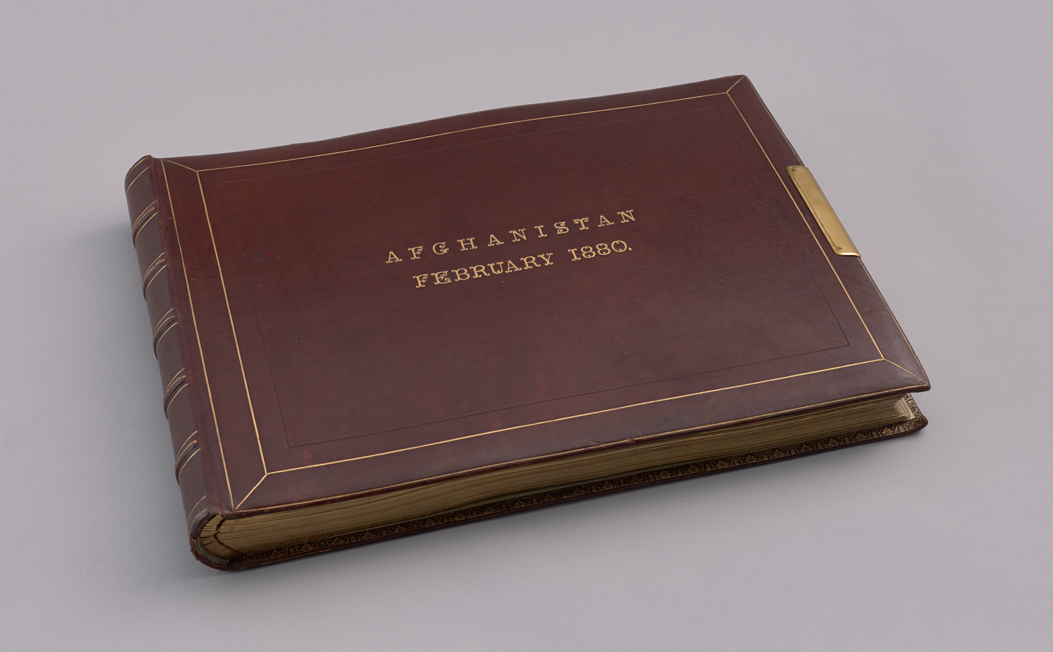 Brown leather-bound book with gold trim and gold lettering on cover. The cover reads "AFGHANISTAN FEBRUARY 1880". The book has a rectangular shape with rounded corners. The gold trim forms a border around the cover and there are three thin gold lines on the spine. A gold clasp is on the right side. The pages are yellowed. The background is gray. The book is titled "Afghanistan, February 1880" by John Burke.