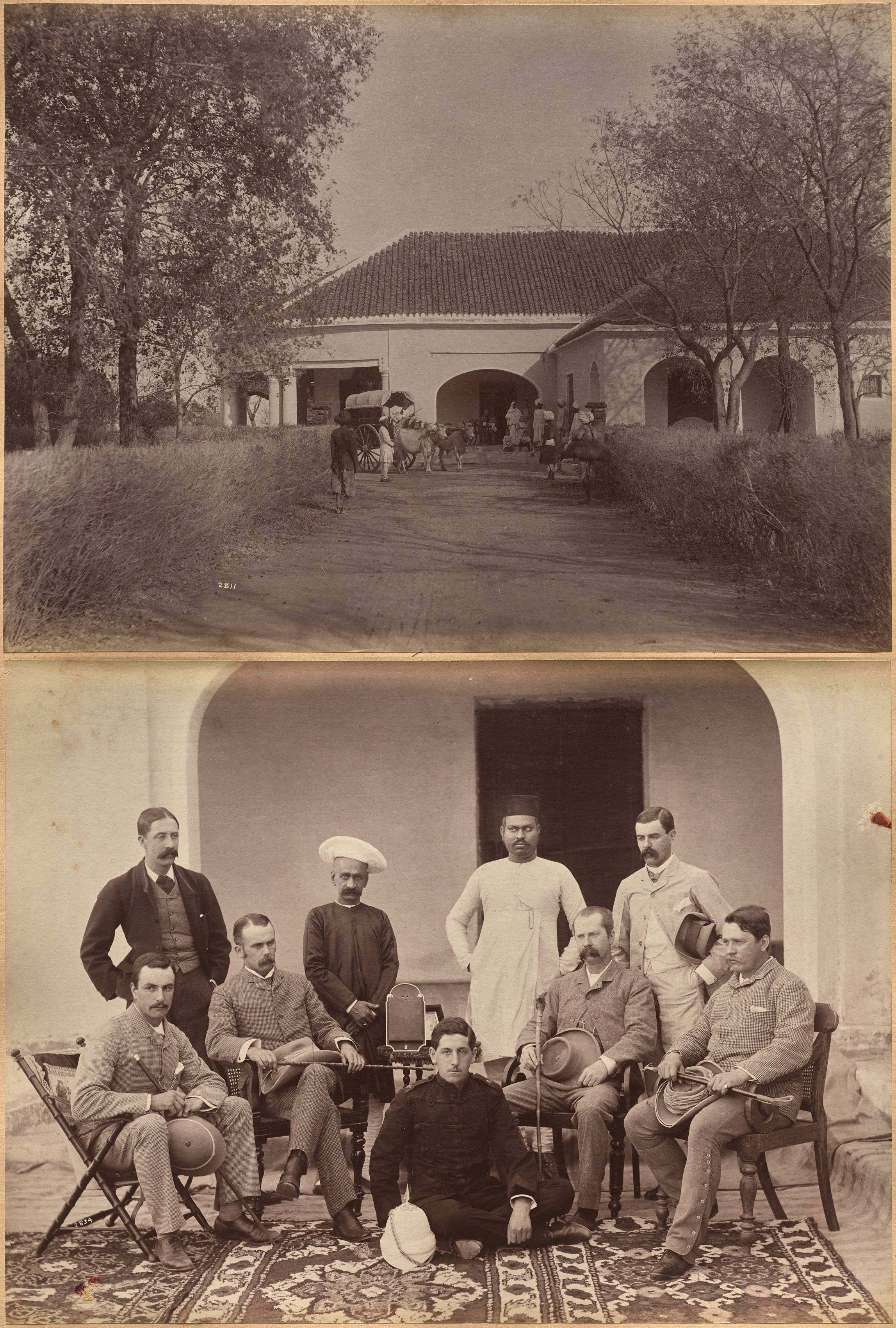 The image features two black and white photographs. The top photograph shows a white building with a tiled roof and archways. A horse-drawn carriage is driving through the archway. People are standing near the carriage. There are trees on both sides of the building. The bottom photograph shows a group of nine men sitting and standing on a rug. They are wearing various styles of clothing including suits, and turbans. There is a rug under their feet. The background is a white wall with an archway.