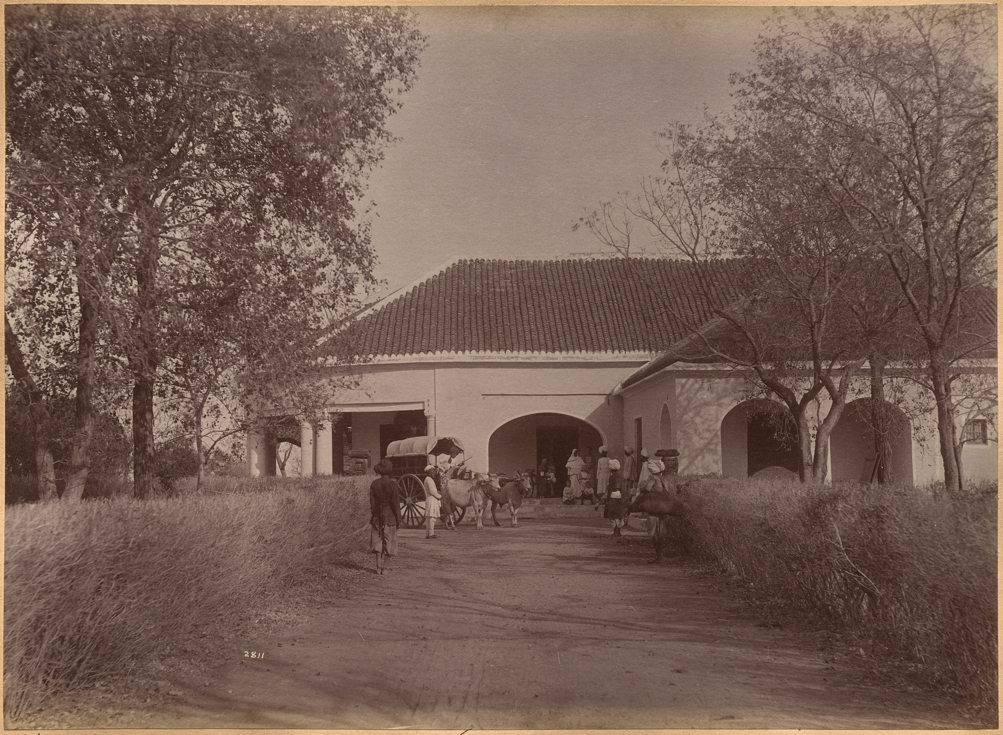 Sepia-toned photograph. Large building centered. Tiled roof. Three large archways. Two smaller openings on left side. Dirt road leads to building. Tall grass on both sides. Large trees on both sides. Two horse-drawn carriages on road. People around carriages. Animals harnessed to carriages. Overcast sky.