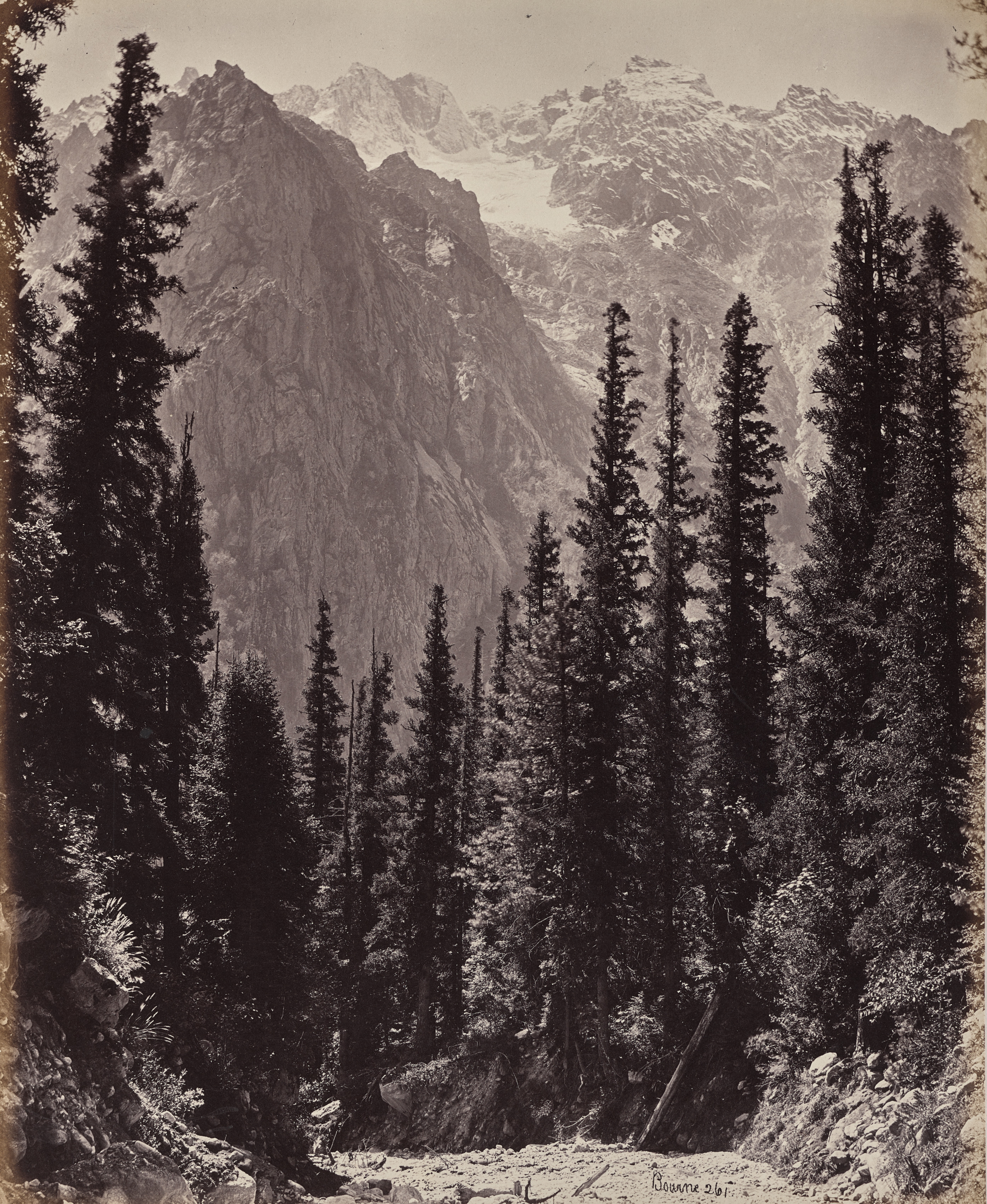 Black and white photograph of a valley with tall mountains and coniferous trees. The mountains are in the background and have steep sides with some snow on their peaks. The mountains are brown due to the photograph being in black and white. There are several tall coniferous trees in the foreground. The trees are on a slope and there are rocks on either side. The photo shows a dirt path at the bottom. The photograph is sepia-toned with darker shadows. The photograph has a darker border on the left. The image has a white border on the right. The photograph is titled and by an artist.