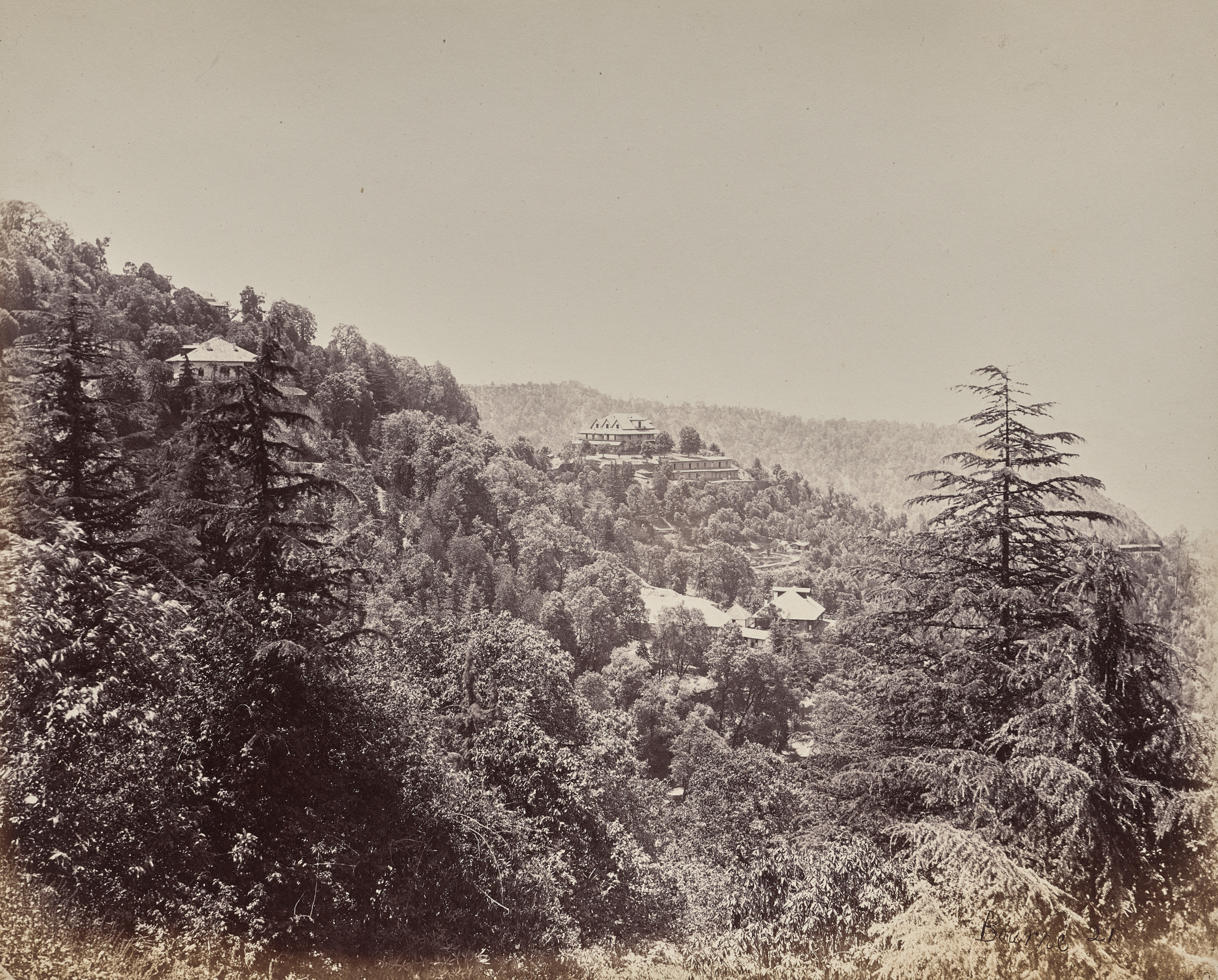 Black and white landscape photograph. A hillside densely covered in trees and other vegetation. Several large buildings are nestled among the trees on the hills. A tall evergreen tree stands in the right foreground. A house with a pyramid-shaped roof on the left. A set of large buildings with flat roofs in the center. Additional hills covered in trees in the background. Sky is clear and light-colored. Faded sepia tone. Taken by Samuel Bourne. Title: Shimla. The Yarrows and Neighboring Hills.