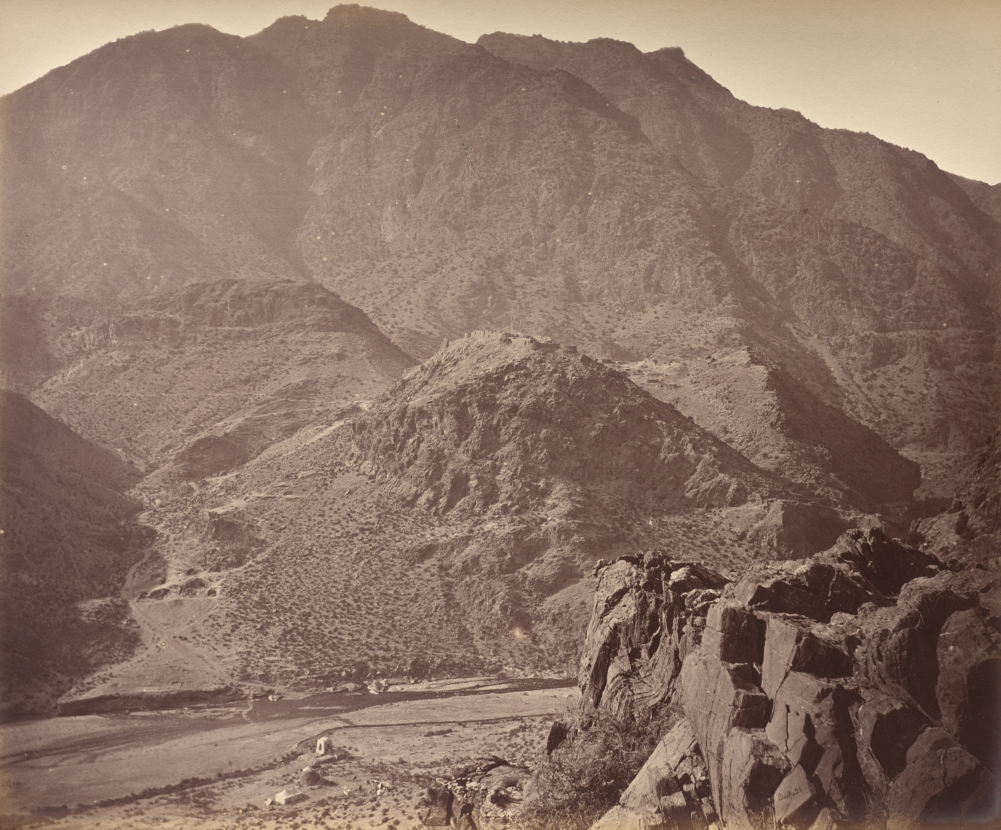 Large mountain with rugged terrain and steep slope. A flat valley floor in the foreground with desert shrubs. Large boulder on the right. A sepia-toned, monochromatic photograph. Title: Ali Musjid and Surroundings. Artist: John Burke.