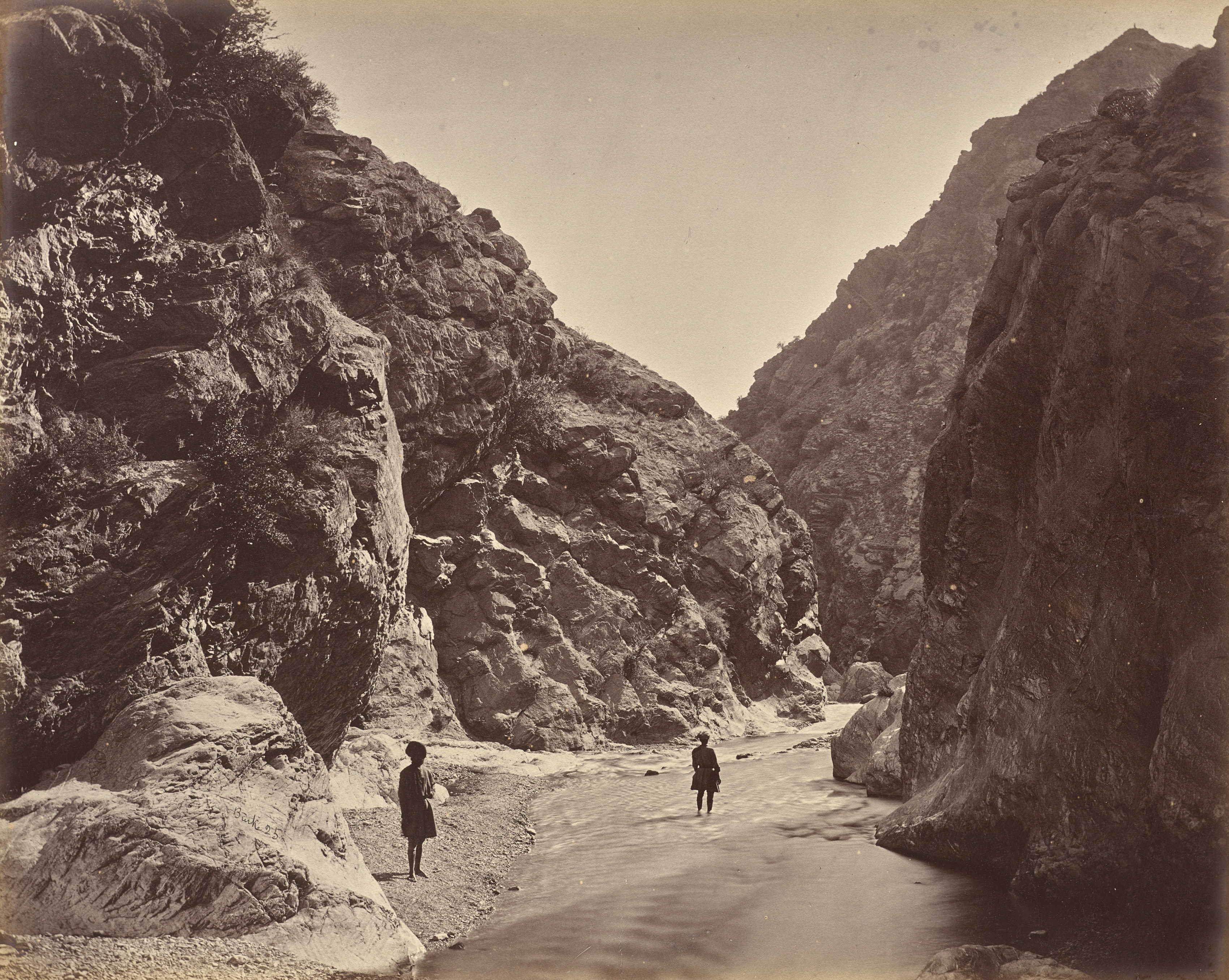 End of the Defile, Looking Back at Ali Musjid by John Burke: A sepia-toned photograph of a narrow riverbed surrounded by steep, rocky cliffs. Two men walk along the riverbed, one in the distance and one closer to the viewer on the left. The cliffs are rugged and rocky, with some vegetation on top of the left cliff. The riverbed is sandy and has a small stream running through it. The sky above is clear and light-colored.