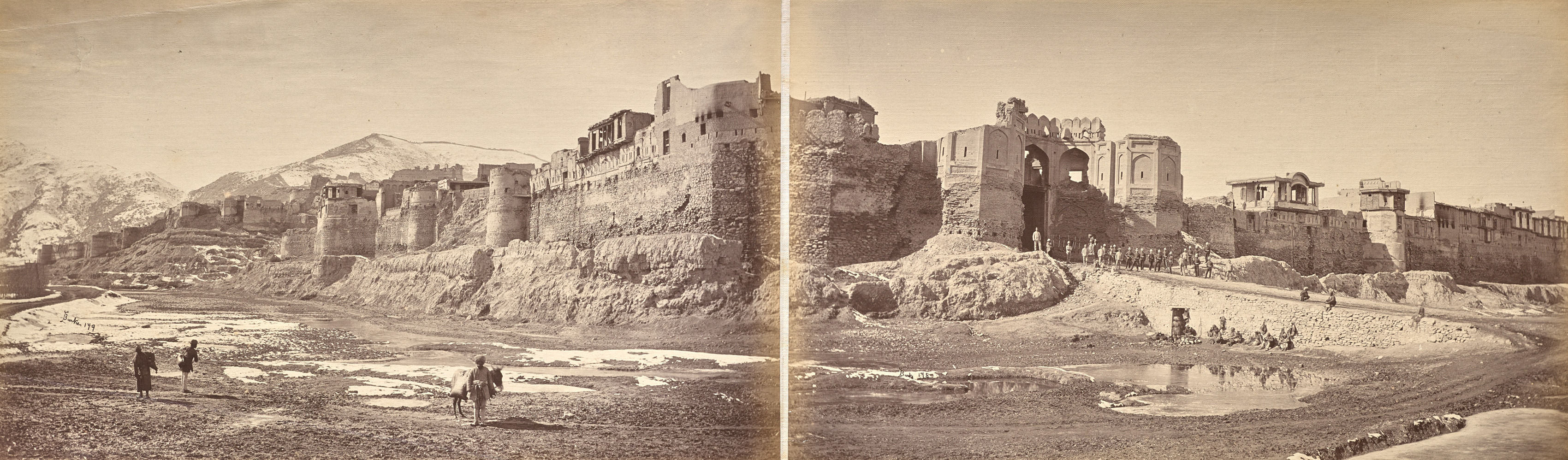 The image is a sepia-toned, panoramic photograph of the Bala Hissar fort in Kabul, Afghanistan, taken by John Burke. The photo is a composite of two images stitched together. The fort is situated on a hill, made of stone and featuring numerous towers and battlements. A riverbed or dry river runs in front of the fort, with some water present. People and animals are visible in the foreground, and mountains are in the background. The sky above is clear. The fort's walls are constructed from stone and have a rough texture. Towers of varying heights are present along the walls. A large gate is visible on the right side of the image. The overall atmosphere suggests a daytime setting with clear weather. The image is rendered in shades of brown, with no vibrant colors present. The photograph's style and tone are consistent with 19th-century photography. The image presents a historic view of the Bala Hissar fort.