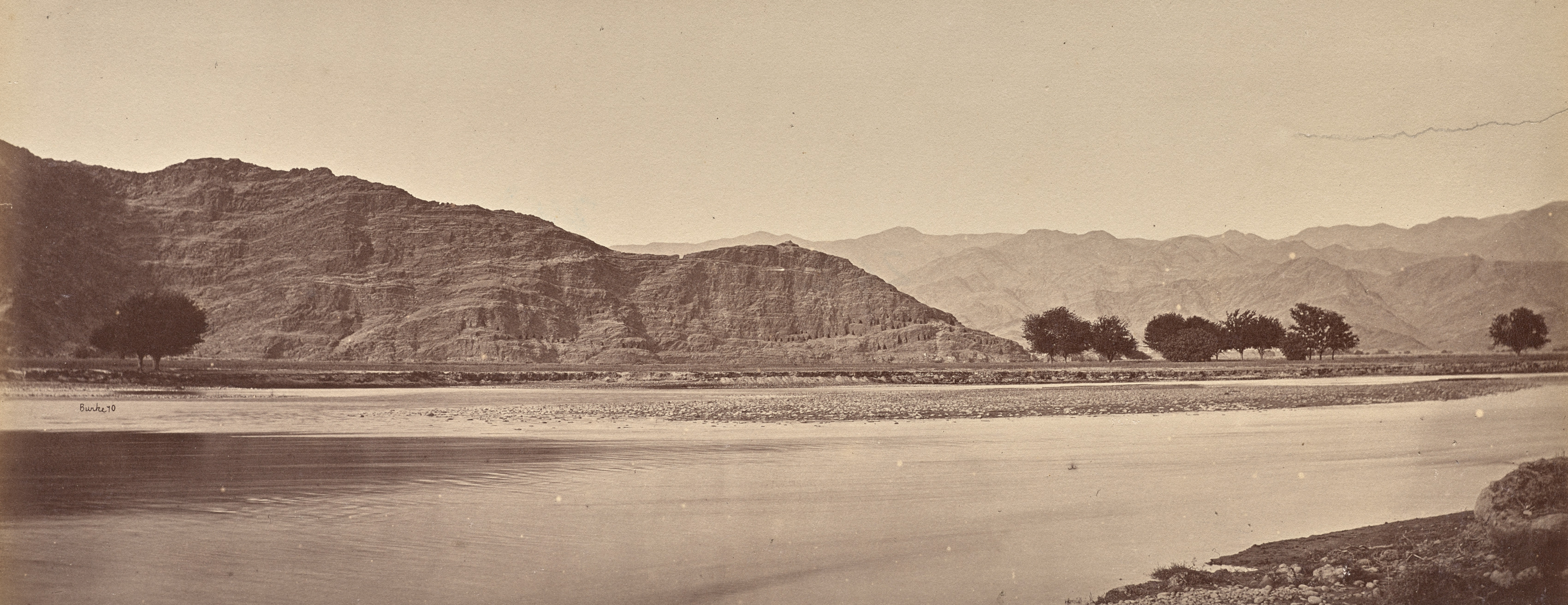 The photograph shows a large body of water with a mountain range on the left side and another range behind it. The mountains on the left are closer and have a steep slope with a flat top. The surface appears dry and cracked. A line of trees sits on the right side of a beach in front of the mountains. The water stretches from the bottom left corner to almost the right side. A small area of land juts out from the right edge into the water. The sky is clear and fades to white at the horizon. The image is sepia-toned. The title of the work is "Bassaule, the Hill of Caves" and the artist is John Burke.