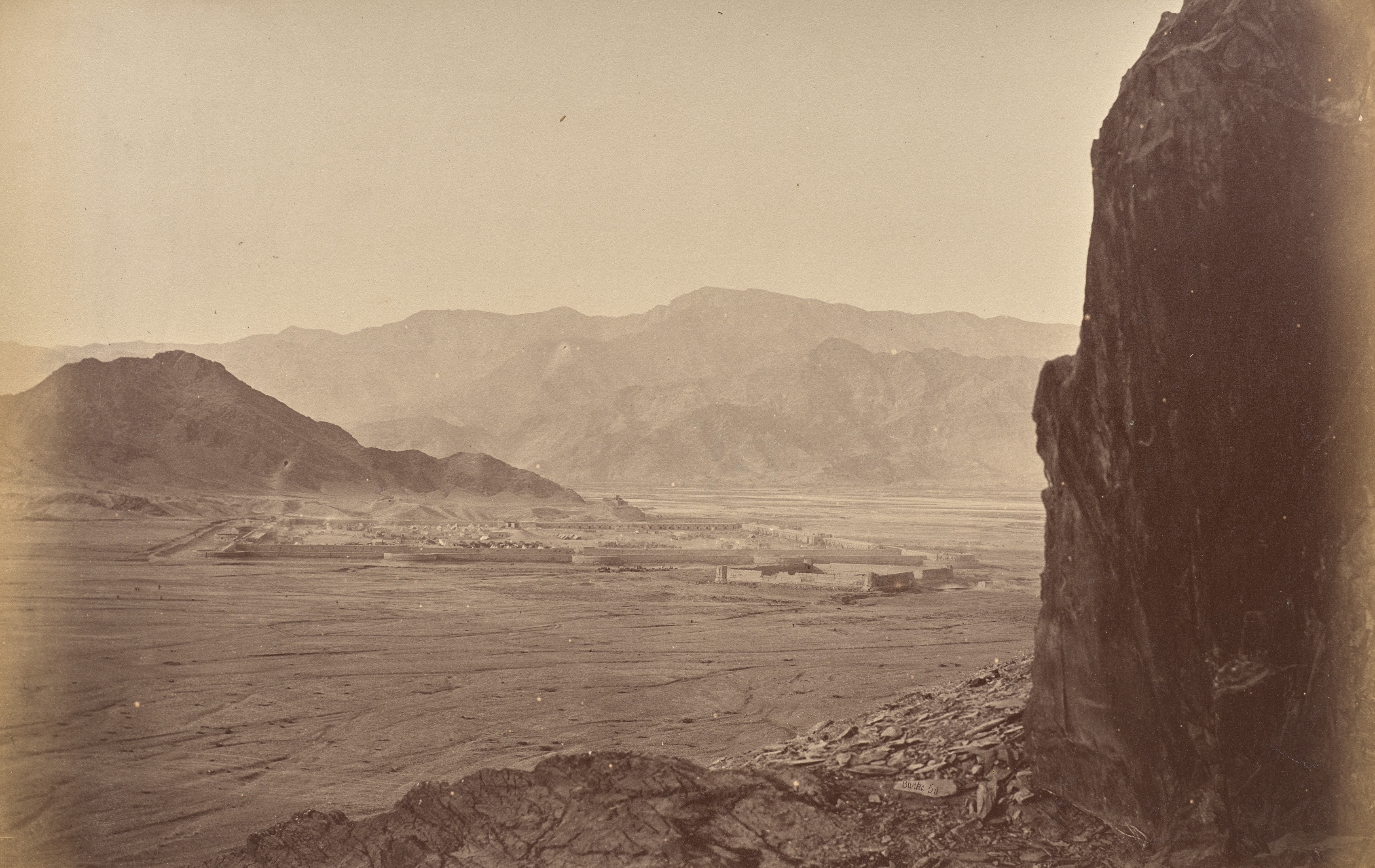 Sepia-toned landscape photograph, General View of Dakka by John Burke. A large, dark rocky outcrop stands on the right side. In the background, a valley with flat, dry ground and low buildings stretches towards mountains. The mountains in the distance are hazy and have a range of rounded peaks. The foreground has a rocky outcrop and flat ground with some sparse rocks.