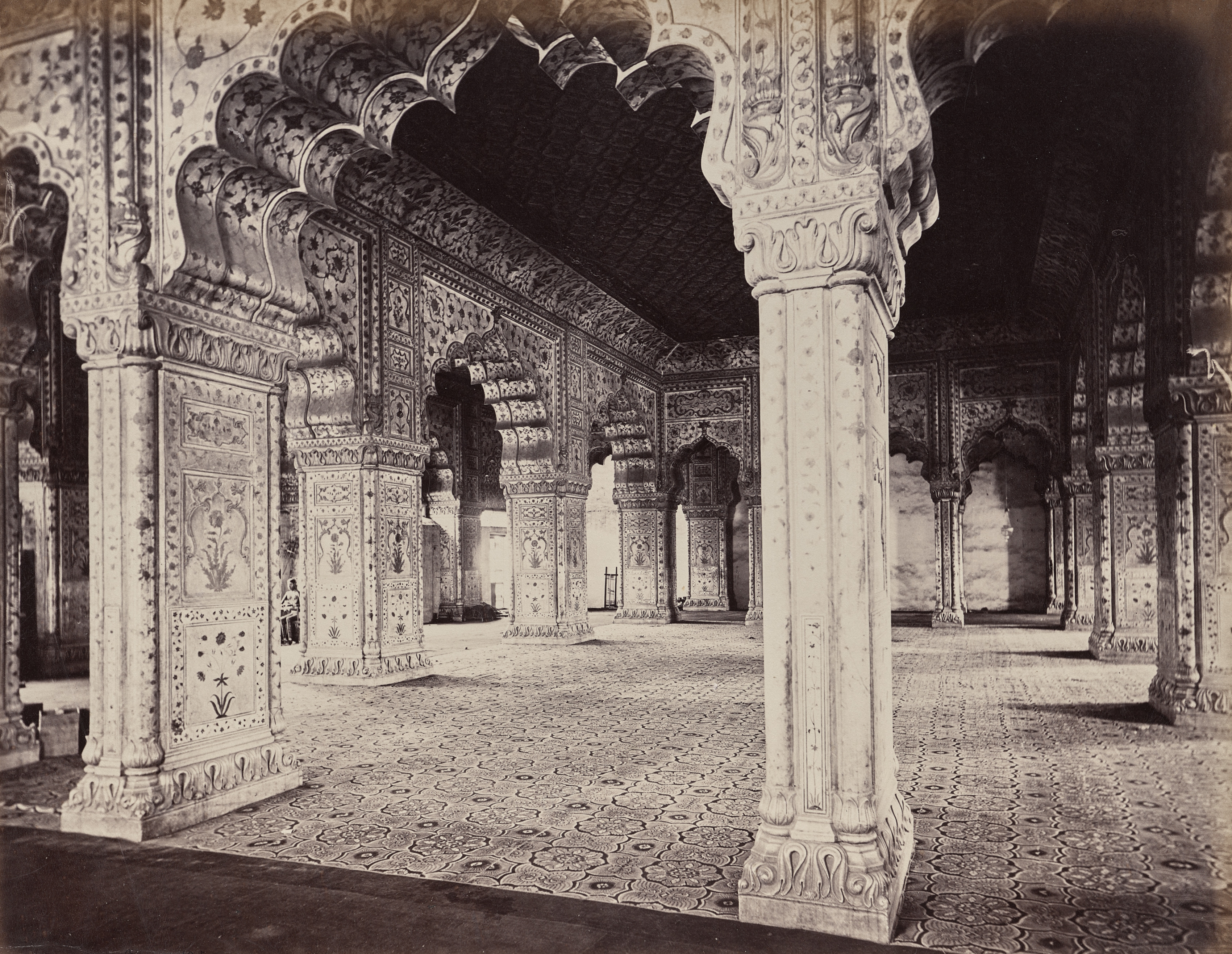 The image shows a black-and-white photograph of an ornate interior space. The room has a tiled floor with a patterned design. There are several columns and archways throughout the room. The walls and columns are decorated with intricate carvings and designs. The ceiling is dark and appears to be made of wood or another material. The overall atmosphere suggests a historic or cultural building, possibly a palace or temple. The image is titled "Delhi. The Emperor's Palace. Interior of Dewani in Private Hall" and was taken by Samuel Bourne. The photo shows a large room with a high ceiling. Ornate columns support the ceiling. The columns and walls have intricate designs and patterns. The floor is covered in tiles with a repeating pattern. The room appears empty except for one person in the background. The image is dimly lit.